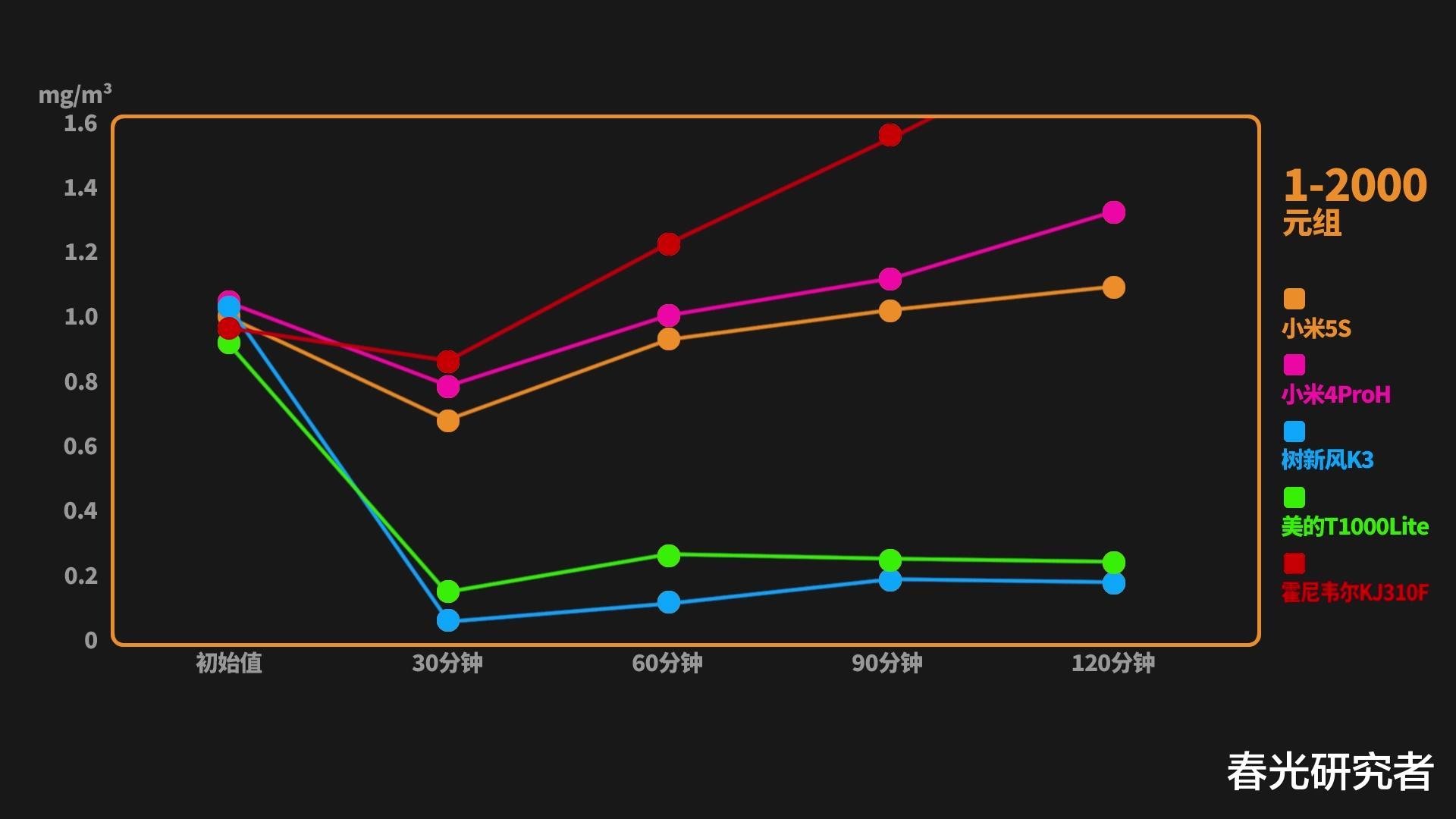 1-2000元组,树新风K3和美的T1000 Lite在第一次进场,也就是30分钟的时候,就已经达标,降低到国标线0.08mg/m³以下。两台米家是在1小时左右,勉强过线。霍尼韦尔KJ301F就要慢很多了,拖到2小时才达标。