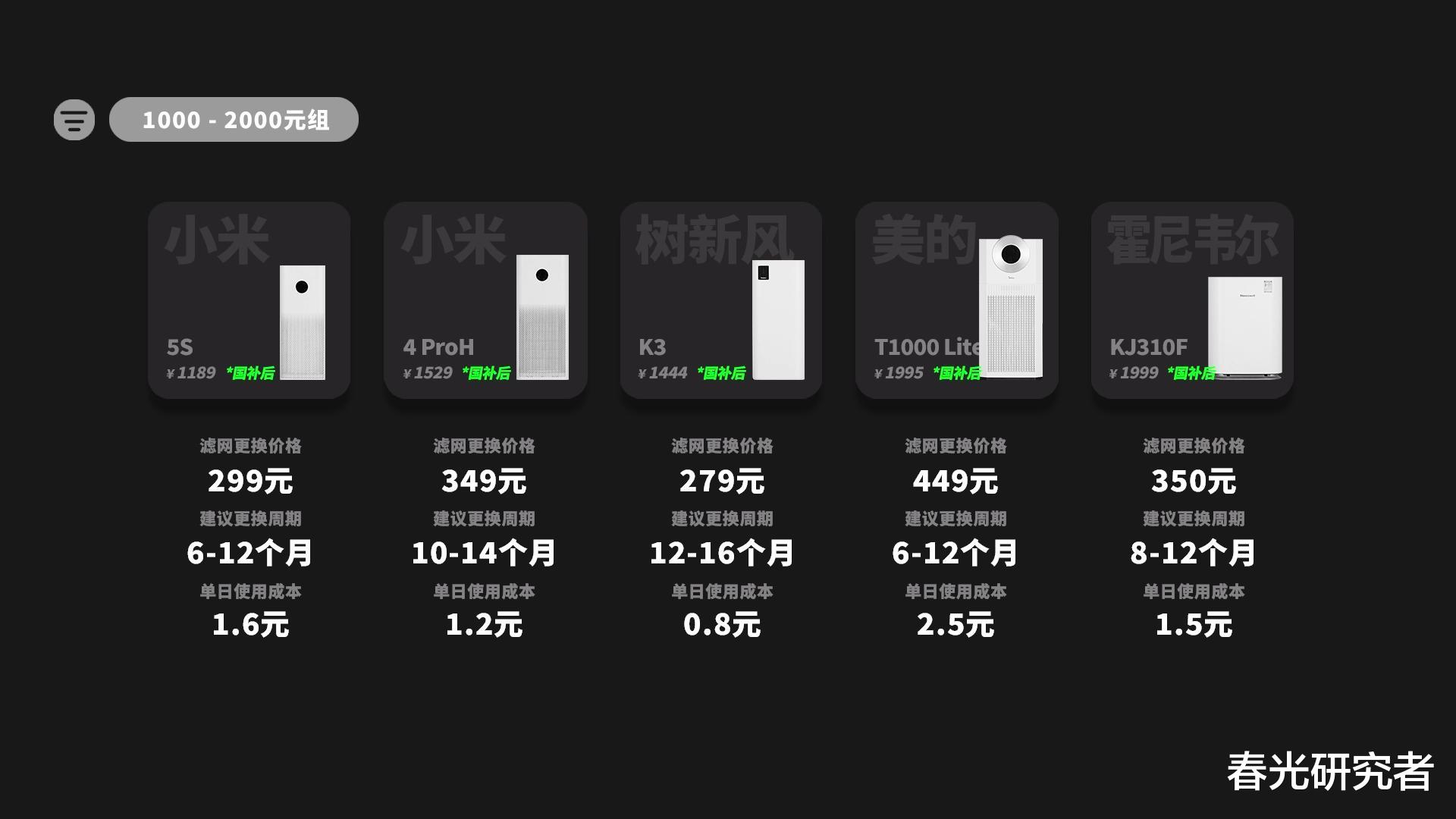 因为各家给出的建议更换周期都是一个区间,所以我们统一按照区间最低值来计算。首先是1-2000元组别,单日使用成本基本都在1块钱左右,相对比较便宜的是树新风K3的0.8元/天,万万没想到这组参数最强的树新风,使用成本反而最低,这是要和小米抢性价比之王的头衔嘛?稍贵一些的是美的T1000 Lite,单日使用成本能达到2.5元/天。