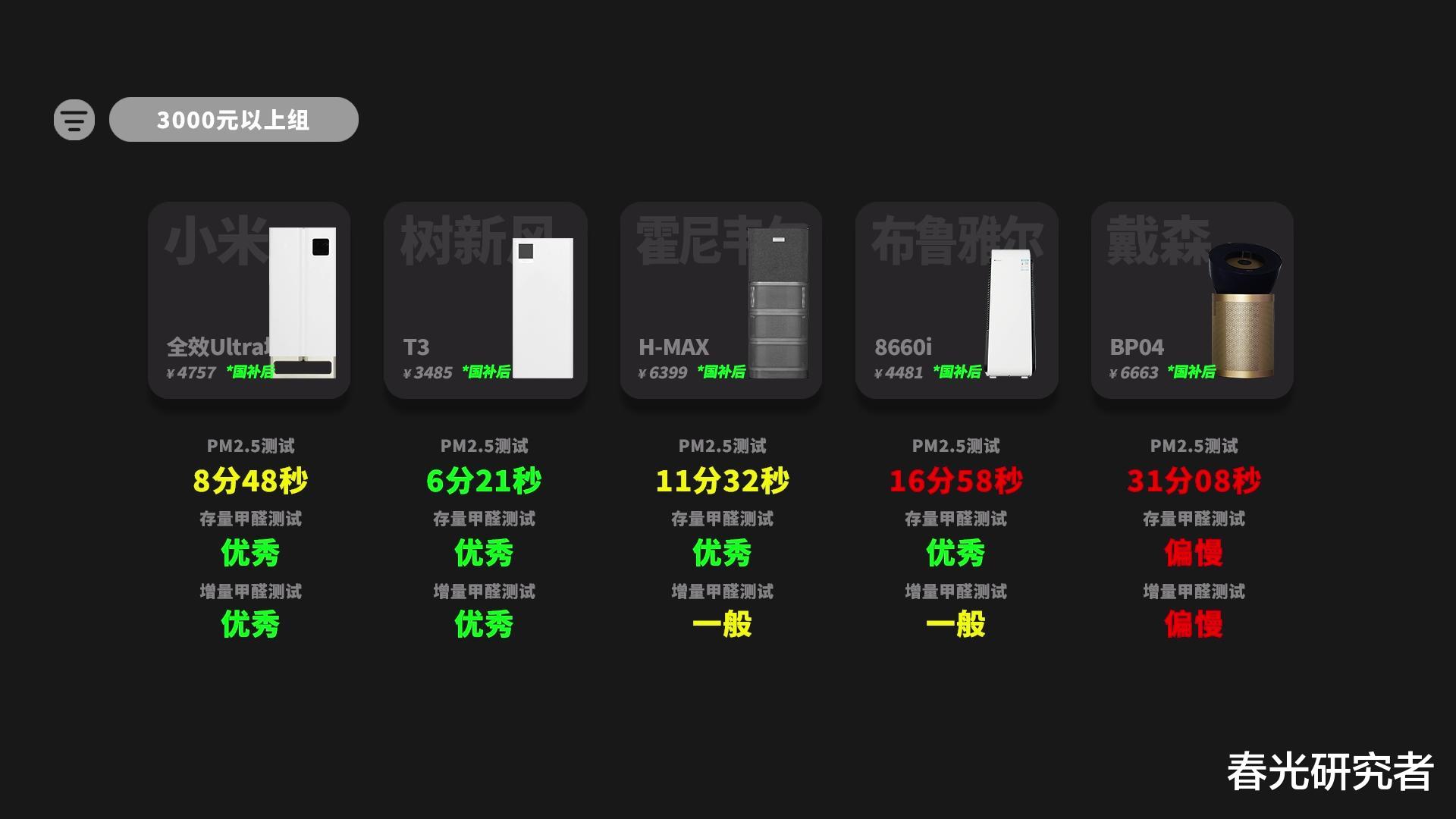 剩下的是3000元以上组别:都是大家耳熟能详的品牌,也都是各家的旗舰款,这个级别的空净几乎都是大满配,包括了米家全效Ultra增强款、树新风T3、霍尼韦尔H Max、布鲁雅尔8660i、戴森BP04。