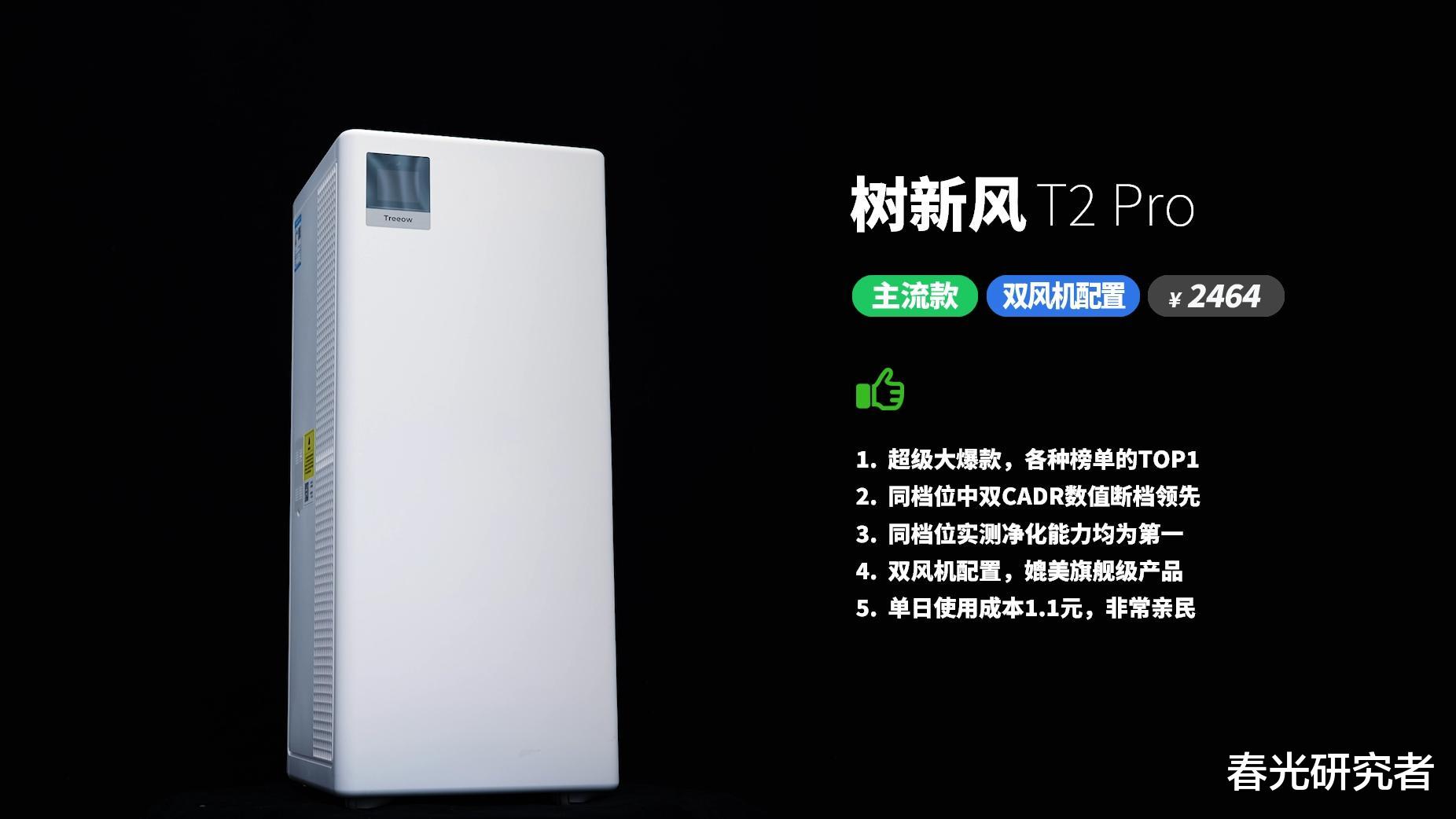接着是2-3000的各家销量主力机型,竞争也是最激烈的。我们这里推荐两款,树新风T2 Pro,数据和实测都是同级最高,甚至放到旗舰级别也很能打,树新风在净化器领域确实很强。