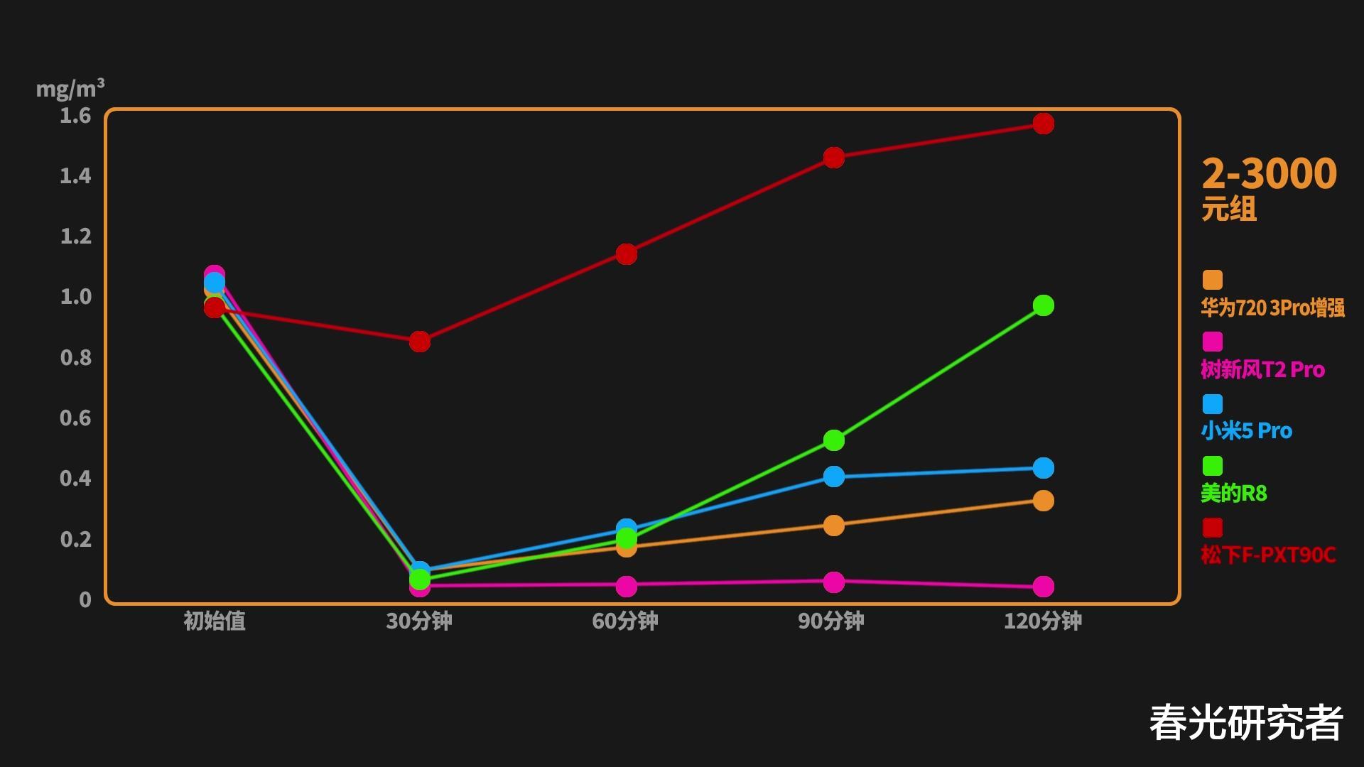 接着是2-3000元组,可以压制住增量甲醛的只有树新风T2 Pro,几乎就是一条直线。华为3Pro增强版和小米5 Pro也还不错,略微有一点点上扬的迹象,不是很明显。美的R8也还不可以,后期略微有点松懈。最后是松下F-PXT90C延续了前几轮的表现,翻车比较严重。
