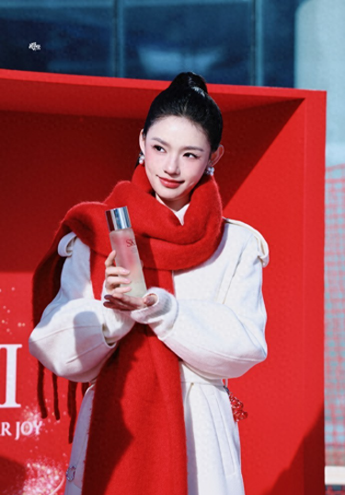 SK2线下活动高清生图,大红色围巾配白色羽绒服,扎着高高的马尾把额头露出来,头颅饱满好有气质,睫毛上还有雪花,这个妆造太漂亮了真有创意!