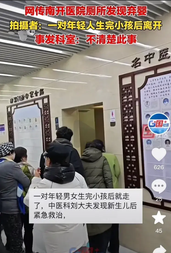 哎呀,大伙儿好啊,最近我听说了一件让人瞠目结舌的事儿——就在咱天津那块儿,南开医院的卫生间,一个25岁的妈妈竟然把自己的孩子扔在那儿,然后就消失得无影无踪,也就留下了那个可怜的娃儿独自在医院的厕所里,惊动了好多警力。下面我就给大家详细说说这个让人惋惜又愤怒的事件到底咋回事。首先,来说说这个弃婴事件是啥时候发生的?就在前几天,也就是12月11日上午11点多钟,位置在南开医院的中医科室。当时,有位女士抱着一个小娃娃,急急忙忙地跑进去上厕所。可是等她出来之后,怀里的小宝贝儿就不见了。这么重要的事儿,值班医生立刻就看到了,他们马上开始对这个小小的生命实施抢救措施,同时也立刻报了警。毕竟抛下新生儿这种事儿可是大事儿,得马上去处理!好在当天,有个有心人正好在那里拿药,就用手机完整地录下了医生发现小宝贝儿、救护他的全过程,紧接着还把这段视频上传到了网上。现在网络传播速度那么快,这段视频没多久就引起了广大网友们的热烈讨论,相关部门也都开始调查这事儿,看看是不是真的。