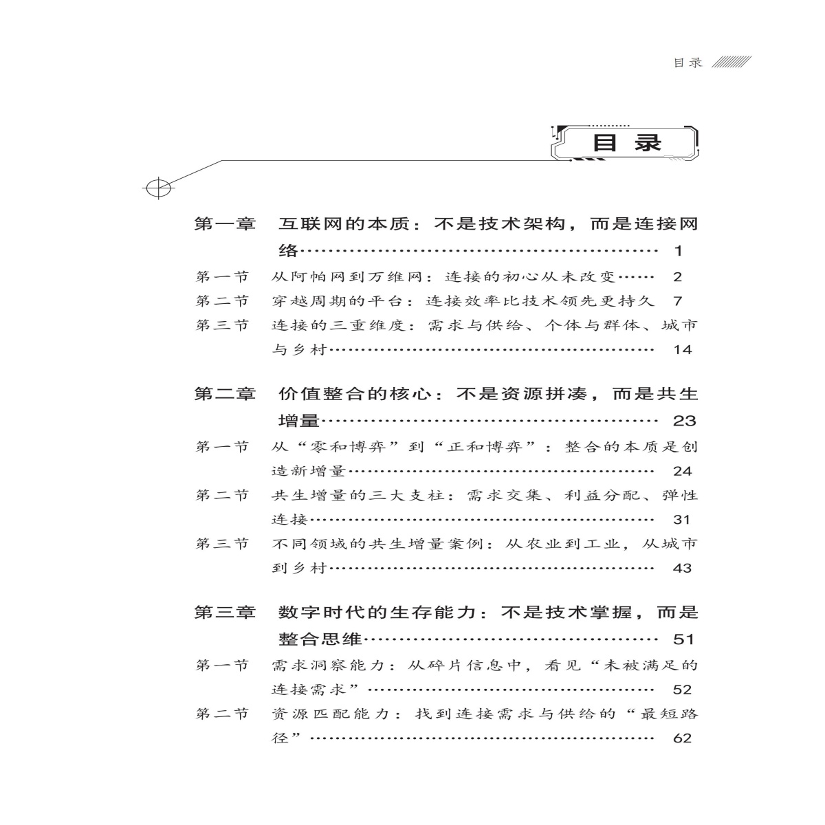 全书沿着四大脉络展开:看透互联网的连接本质、掌握价值整合的共生逻辑、培养不可替代的整合能力、跳出技术焦虑回归人心。每个章节都配有详实的案例和实用的方法,既有理论高度,又有落地路径。