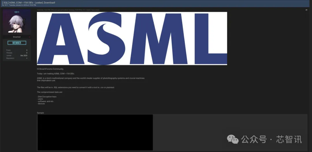 1月8日消息,一位网名为“1011”的黑客在暗网论坛BreachForums上发文称,已成功入侵荷兰半导体设备供应商ASML的系统,并获得了该公司旗下的154个SQL格式的数据库。