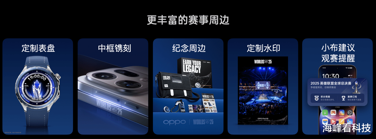 OPPO Find X9 系列更成为 2025 英雄联盟全球总决赛赛场影像官方用机。OPPO 作为 2025英雄联盟全球总决赛(S15)全球合作伙伴,与拳头游戏双方联合重铸 FMVP 奖杯,并为冠军选手定制全球限量手表。同时用户可享赛事定制表盘、免费个性化镌刻服务及 S 赛专属 OS 体验(定制水印、观赛提醒等)。