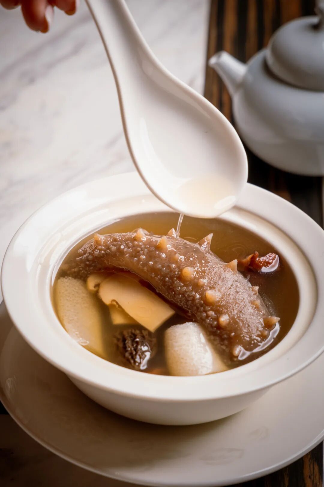 开胃之后,一碗鲜菌炖辽参恰如其分地暖胃又暖心,澄澈汤色下,辽参吸足菌菇本鲜,软糯口感中藏着直达肌理的鲜爽。