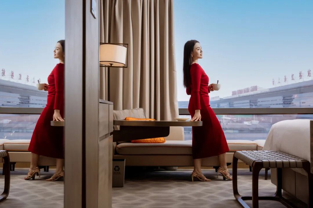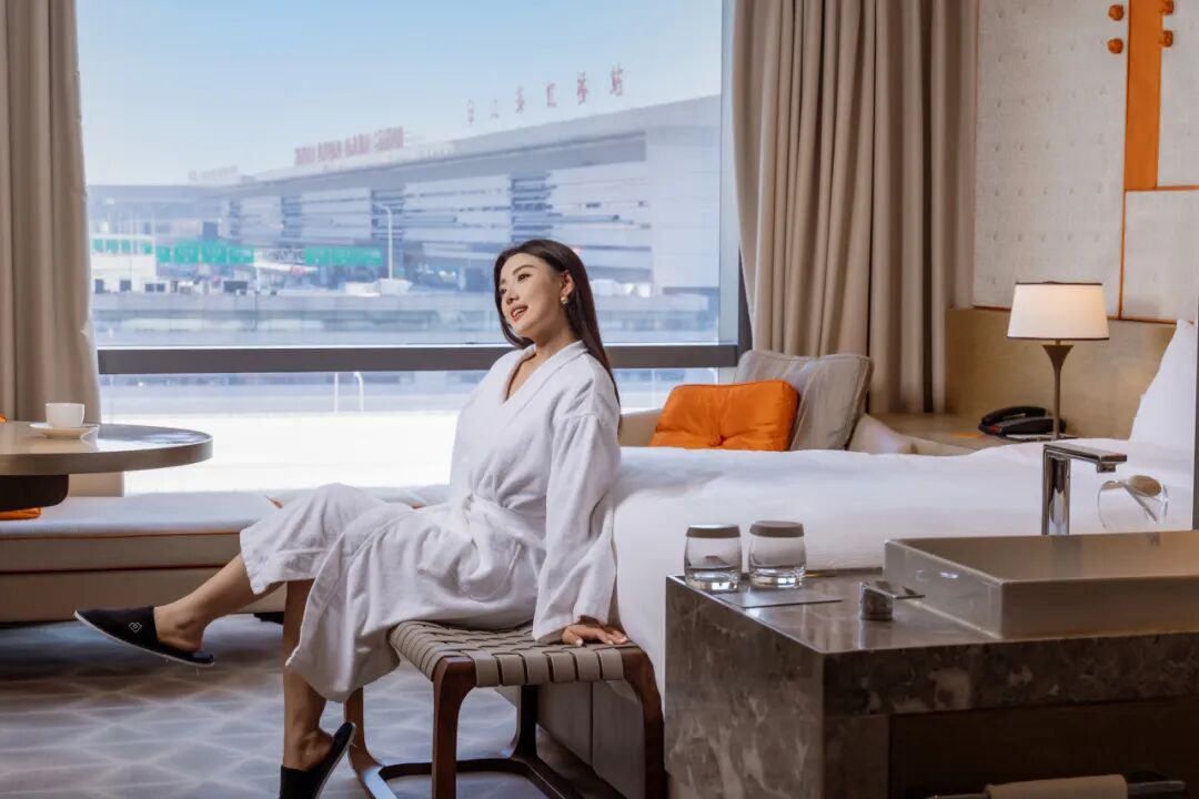 客房以现代简约风格勾勒空间质感,利落线条搭配柔和浅色调,去除冗余装饰,仅以细节彰显格调。窗外直面虹桥枢纽核心,推窗可见枢纽灯火和城市佳景。