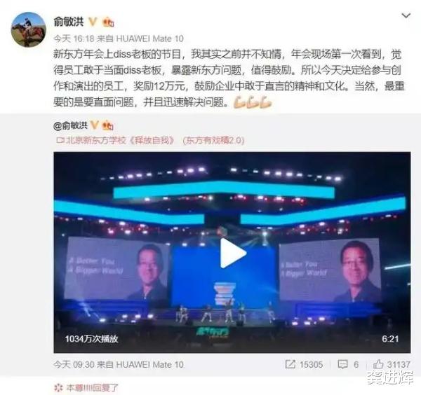 万万没想到,俞敏洪竟然在微博上转发了相关视频,且重重地奖励表演者。他认为,员工敢于当面diss老板,暴露新东方问题,值得鼓励。“所以今天决定给参与创作和演出的员工,奖励12万元,鼓励企业中敢于直言的精神和文化。”