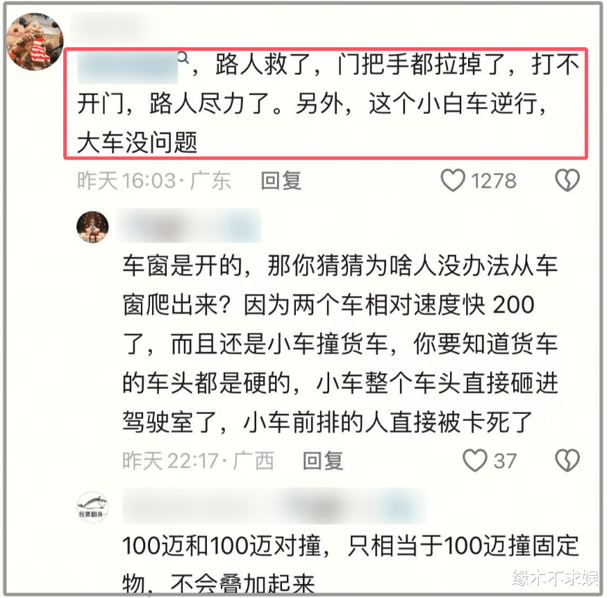 另一位网友则表示车窗是开的,司机却没法从车窗内爬出来,大概率是因为车速太快,而且是小车撞货车,导致小车的整个车头直接砸进驾驶室,小车前排的人被卡死了。