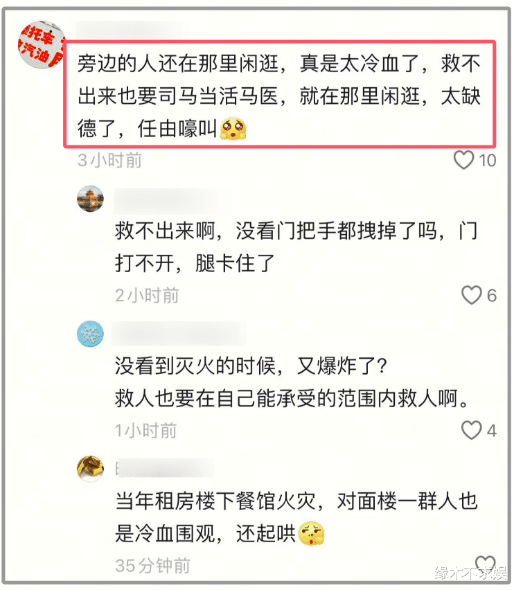 有网友晒出现场的视频,有几位路人在旁边围观,其中一位还揣着兜踱步。这一幕被放到网上后瞬间引发网友热议,有网友痛批这位路人太冷血了。