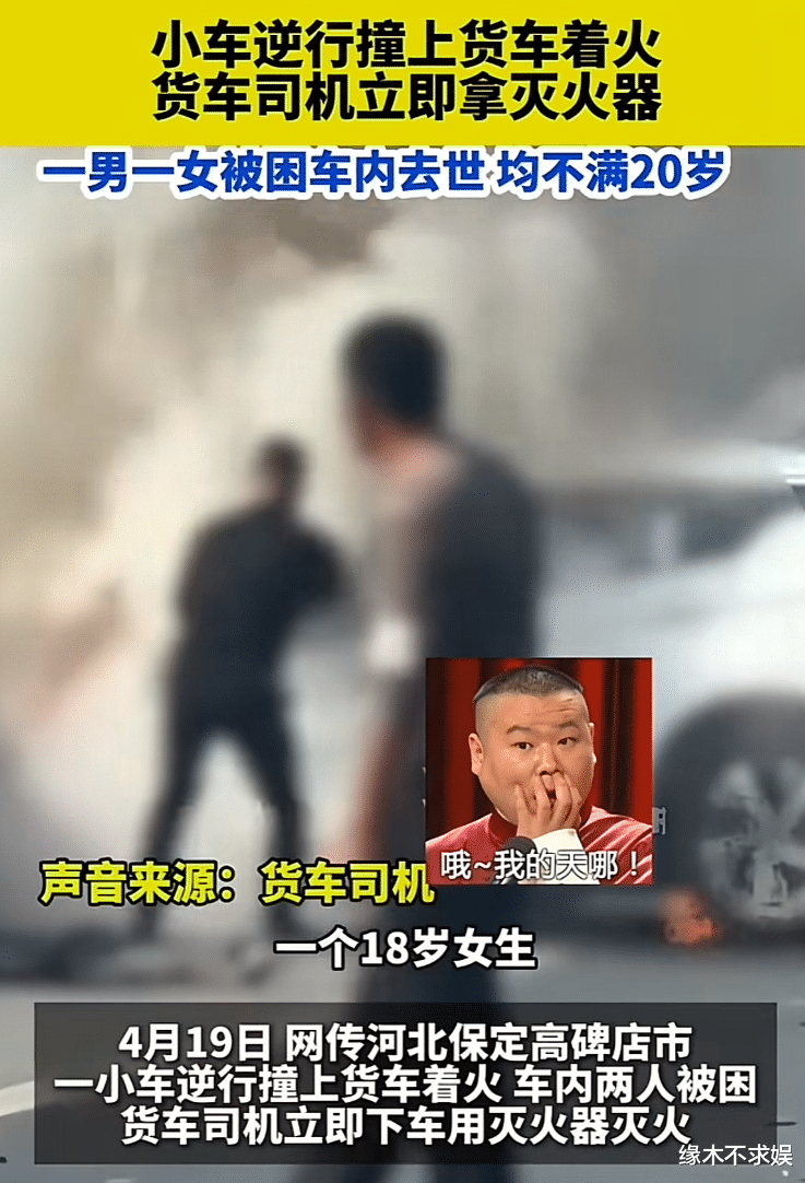 4月19日,网传河北保定的高碑店市发生一起车祸,这起车祸是因为一辆小车逆行撞上了大货车着火。虽然事故责任很清晰,但结果却很惨烈。车祸导致被困在车内的一男一女去世,他们分别是一位18岁的女生和一位19岁的男生。
