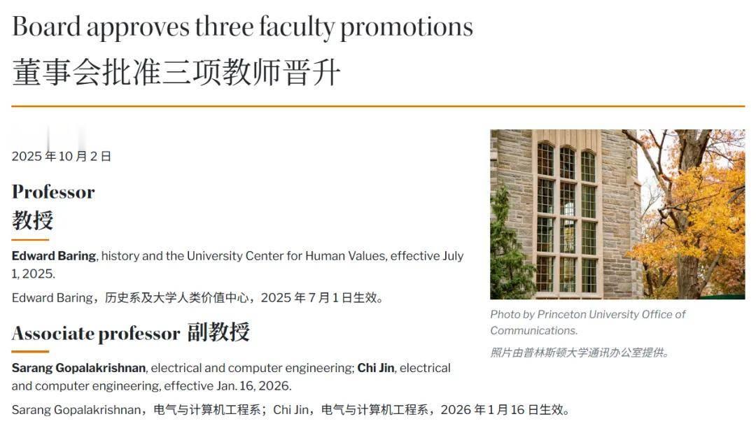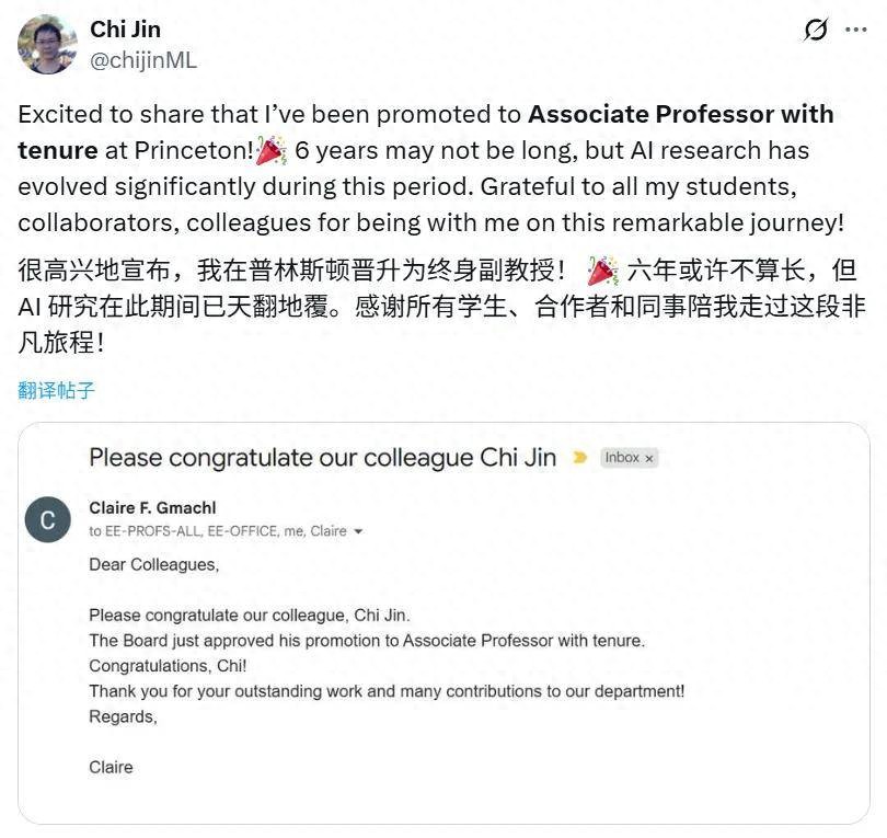 今天,华人学者金驰(Chi Jin)宣布他在普林斯顿晋升为终身副教授。