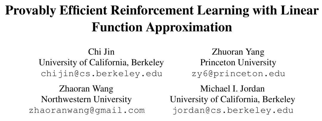 论文标题: Provably Efficient Reinforcement Learning with Linear Function Approximation,COLT 2020 论文地址:https://arxiv.org/abs/1907.05388