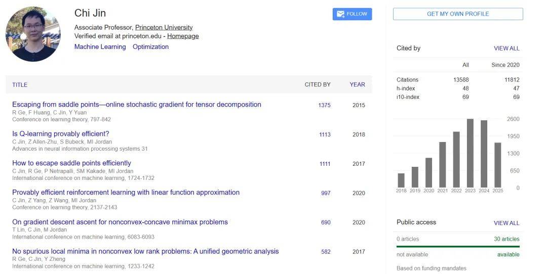 金驰于 2019 年加入普林斯顿大学电气与计算机工程系,担任助理教授。在普林斯顿的 6 年任期内,他在 AI 领域的学术影响力迅速提升。