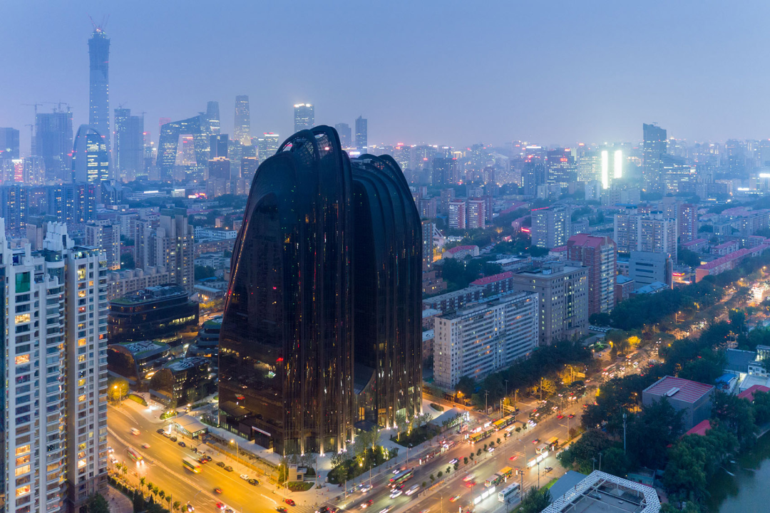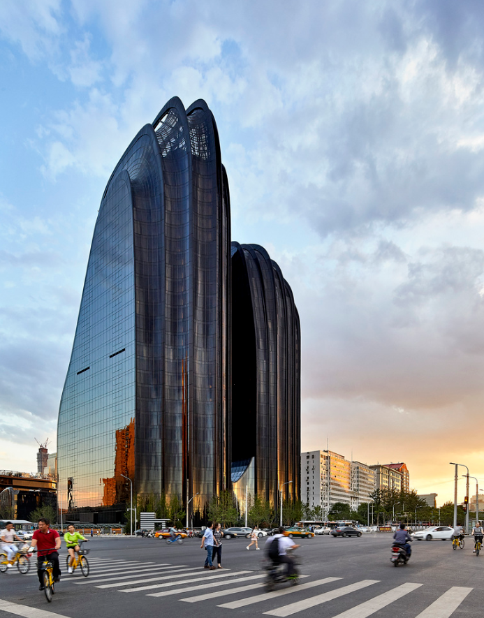 高低错落的楼宇,如同被流水磨蚀的山石,圆润而各有形态。其中双塔主楼象征山峰,大堂从中穿过,仿若飞瀑垂落,整体试图在都市中勾勒出一幅立体的山水画卷。