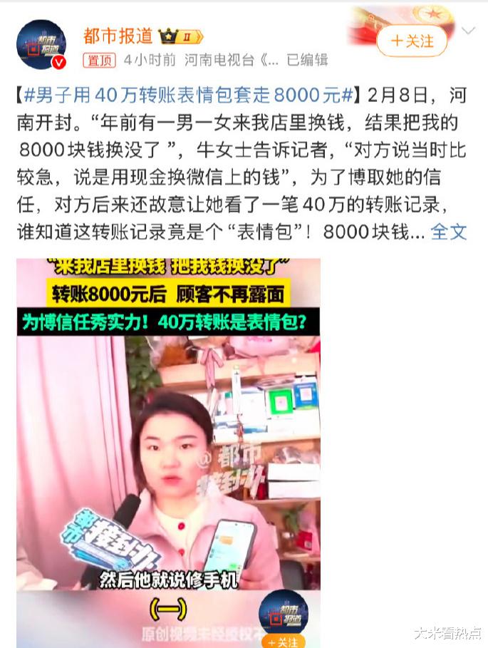 2月8号河南开封那事儿,真的是让人大跌眼镜!有个哥们儿,用了一张假的40万转账表情包,就把牛女士的8000大洋给骗走了。这事儿一出,网上都炸了,大家伙儿纷纷感慨,这年头,诈骗手段真是越来越五花八门了。