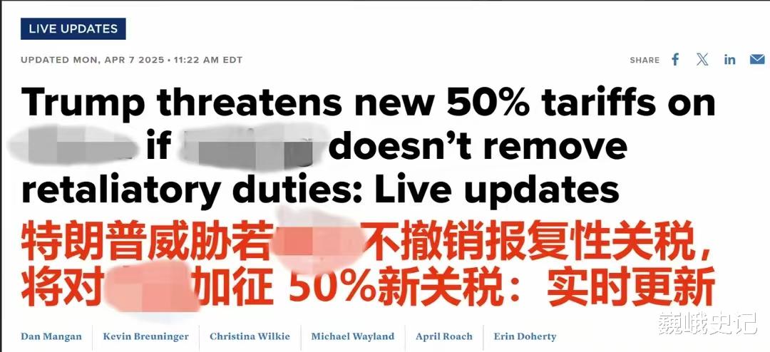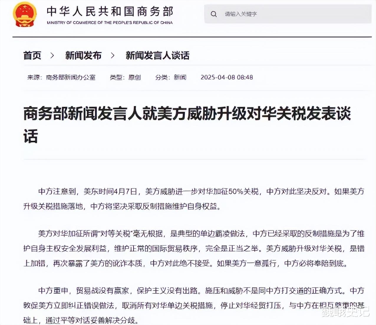 2025年4月7日深夜,美国总统特朗普声称,“如果中方明天不撤回34%的关税,美方将从4月9日起,再对华增加50%的关税。”这番发言表明特朗普已经在这场没有硝烟的战场坐不住了,所以才急冲冲的跳出来“呲牙”。