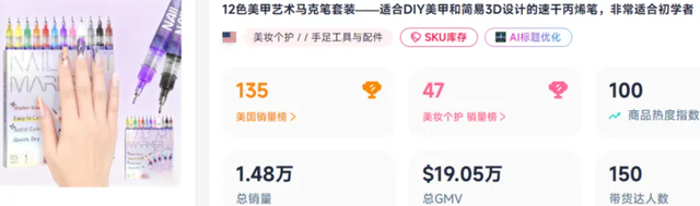 详细来看,这款美甲艺术马克笔来自一家名为US-HollyGifts 的跨境店铺,产品在11月5号才正式上线,距今才刚过半个月,就已经卖出了1.48万件,总销售额达19.02万美元(折合人民币约135.32万元)。