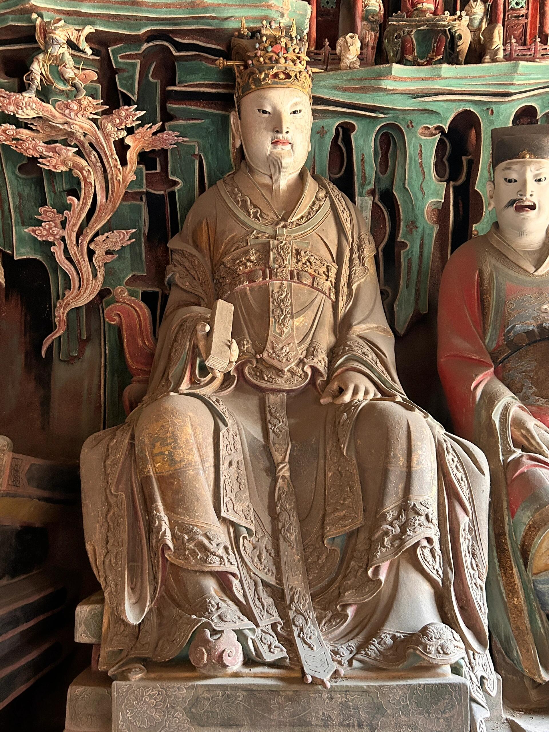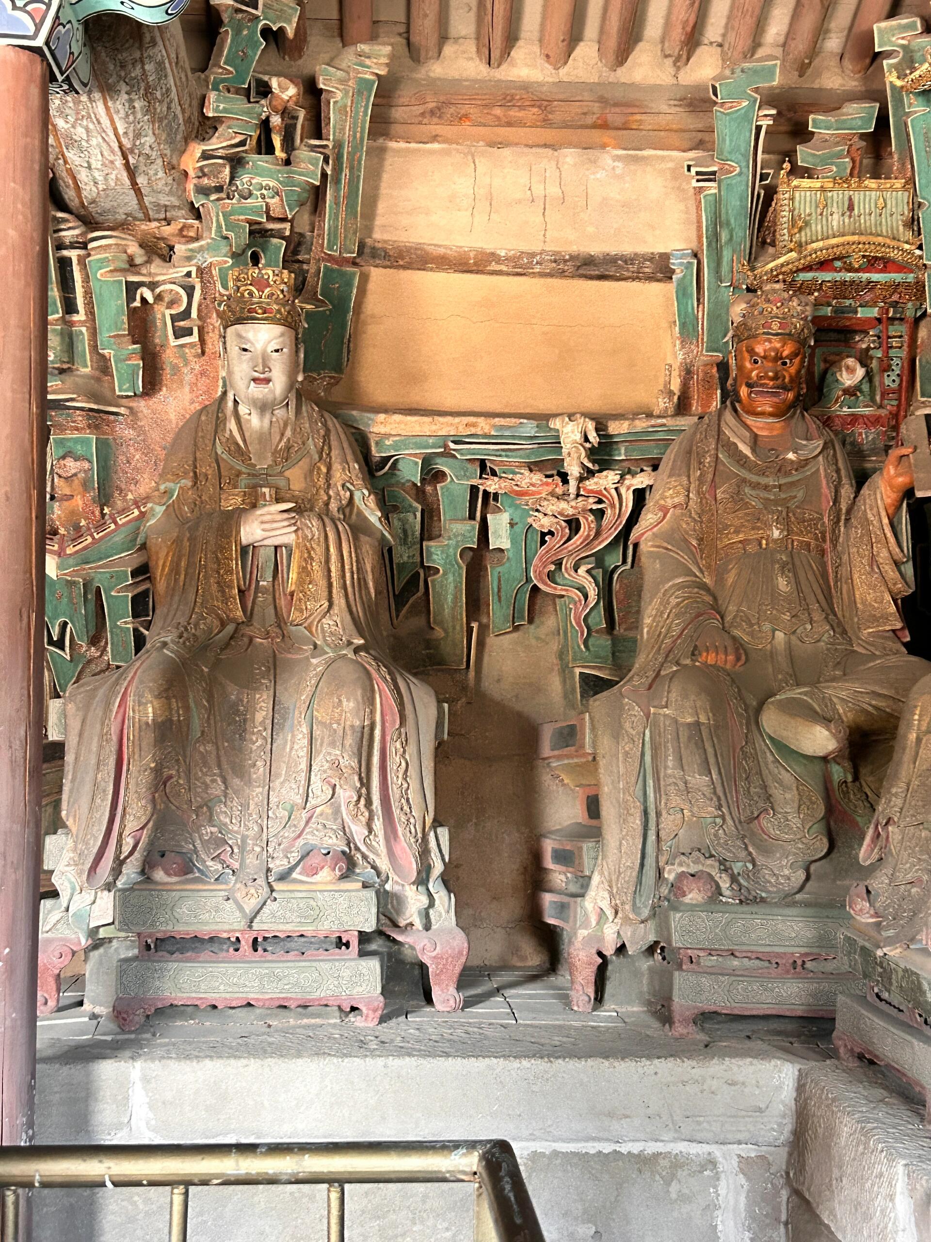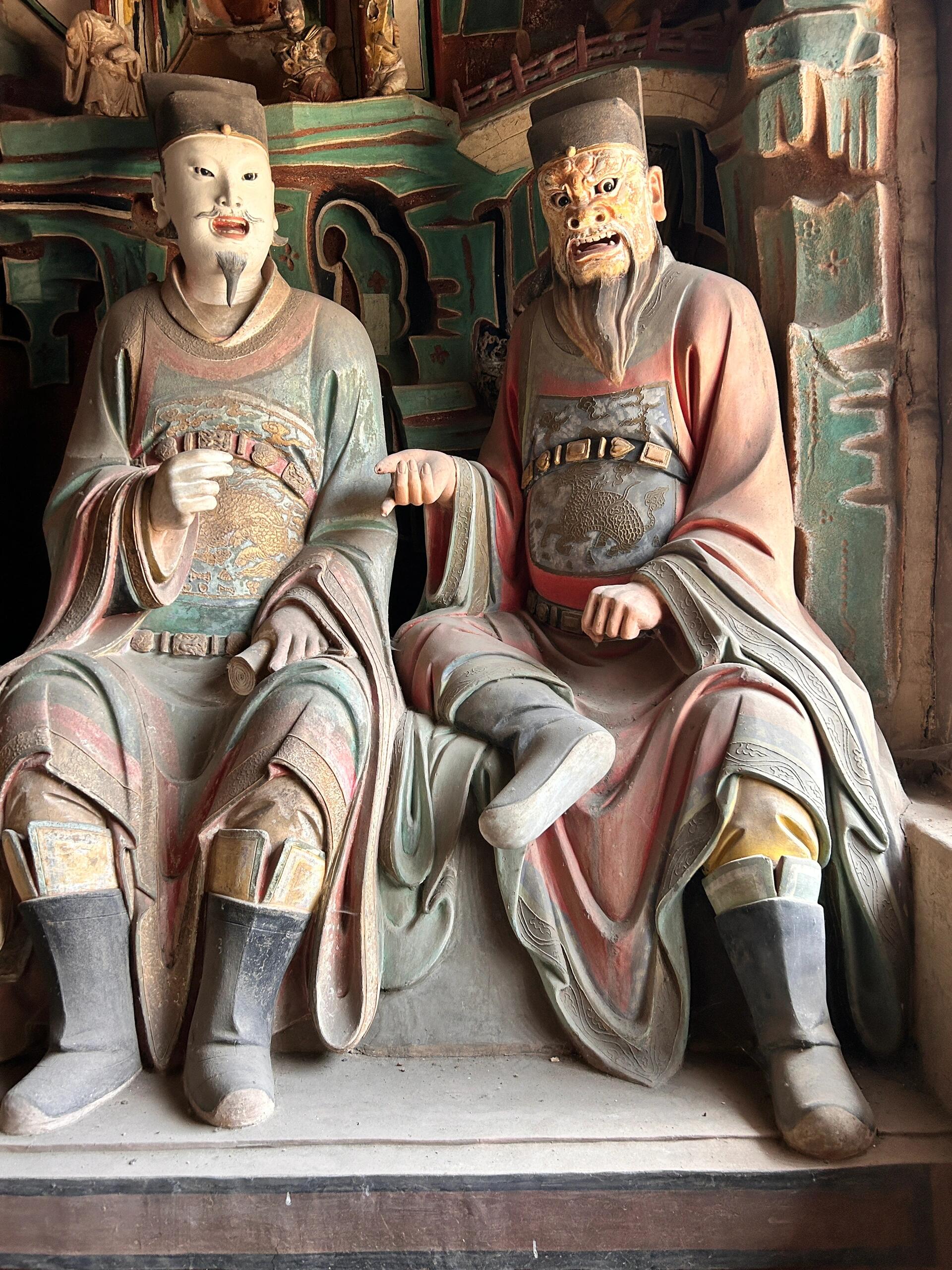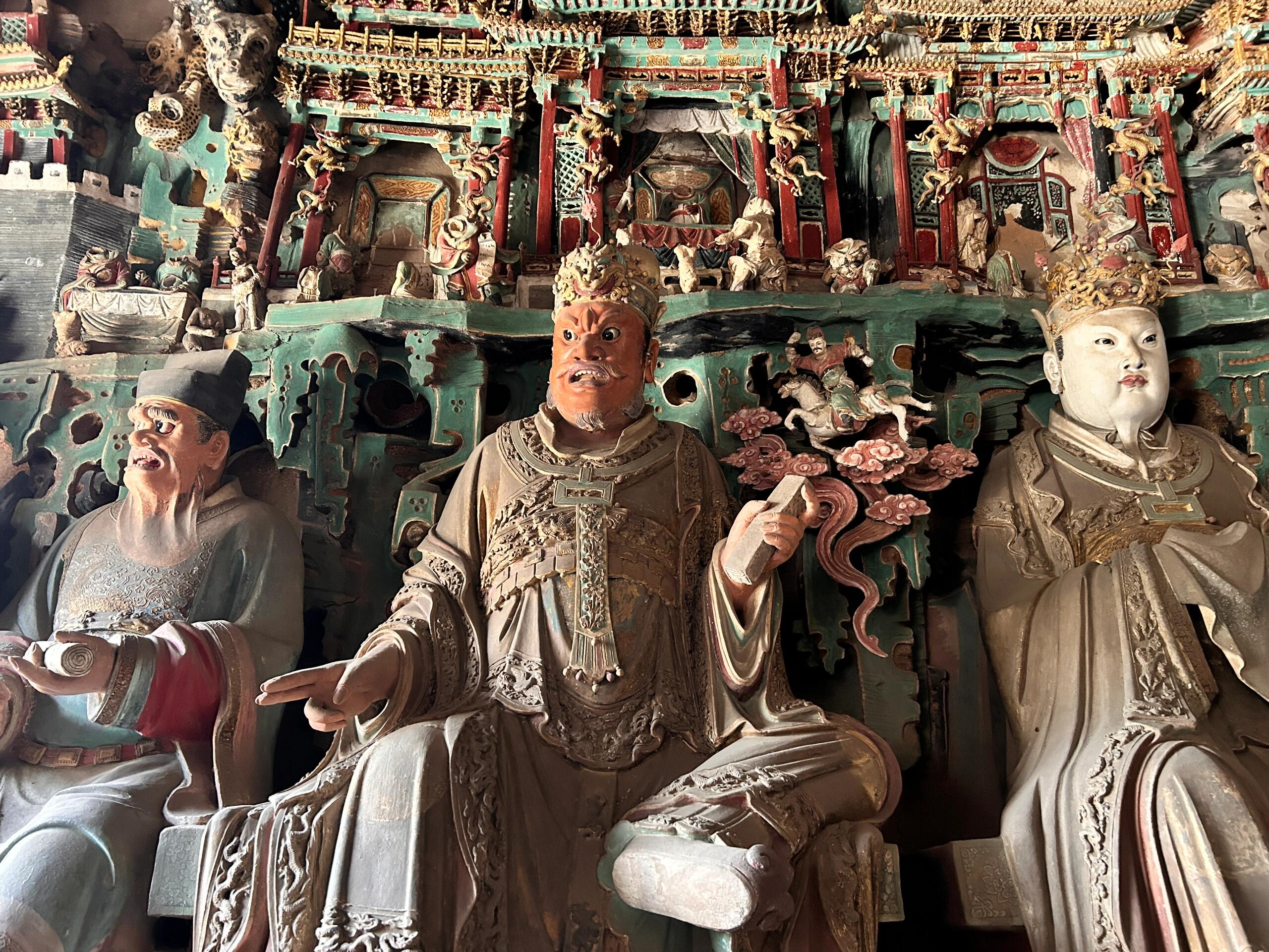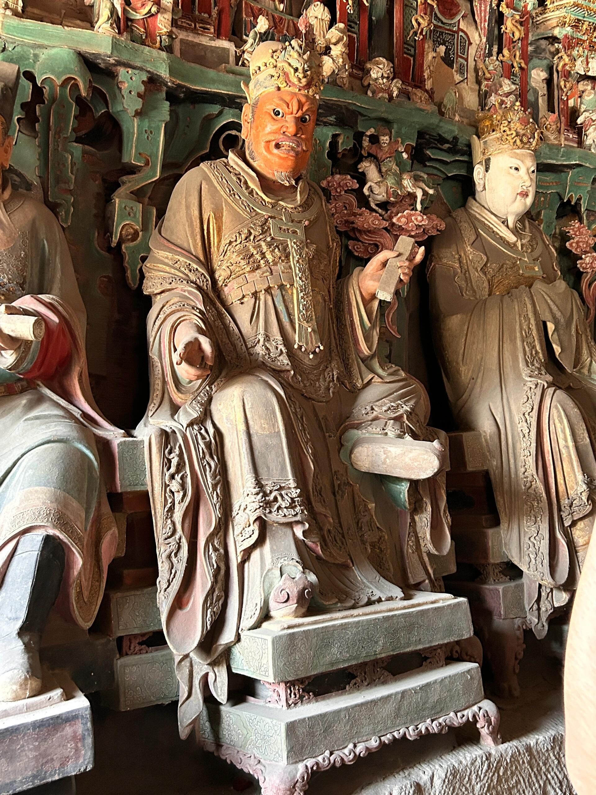 彩塑身上的颜料是真材实料。红的是朱砂调的,黑的掺了松烟,白的里混着铅粉。几百年过去,朱砂褪成了暗红,松烟黑得发乌,只有铅粉还亮着,在阎君的帽翅尖、判官的腰带扣上,透着点冷光。有尊阎君的胡须是真的麻丝做的,现在断了几根,垂下来搭在衣襟上,像老先生没梳好的胡子。这些细节没人特意维护,就这么带着残缺立着,倒比那些新刷了漆的佛像更让人心里发沉——原来神仙鬼怪,也和人一样,会老,会旧,会带着岁月的疤。