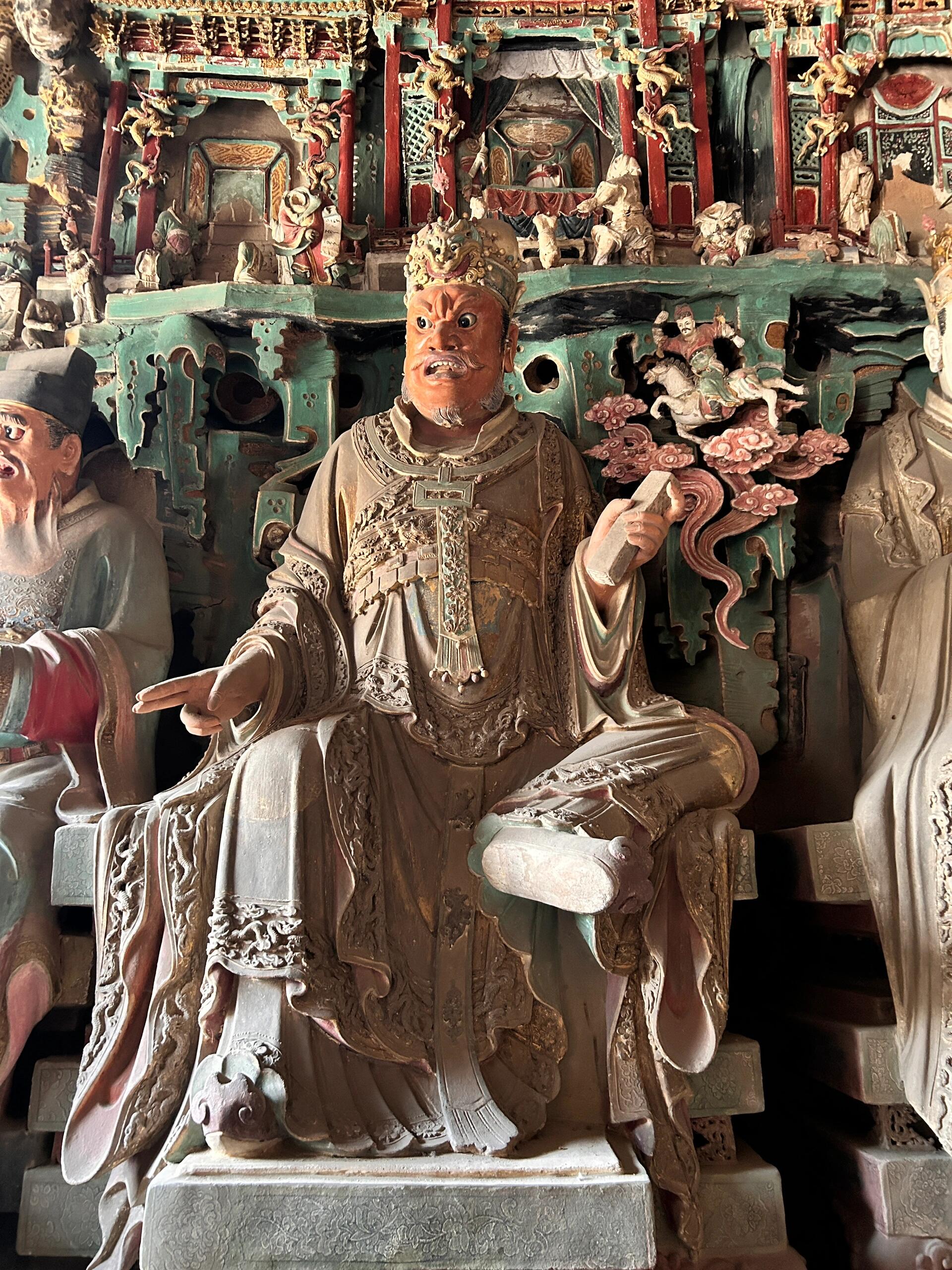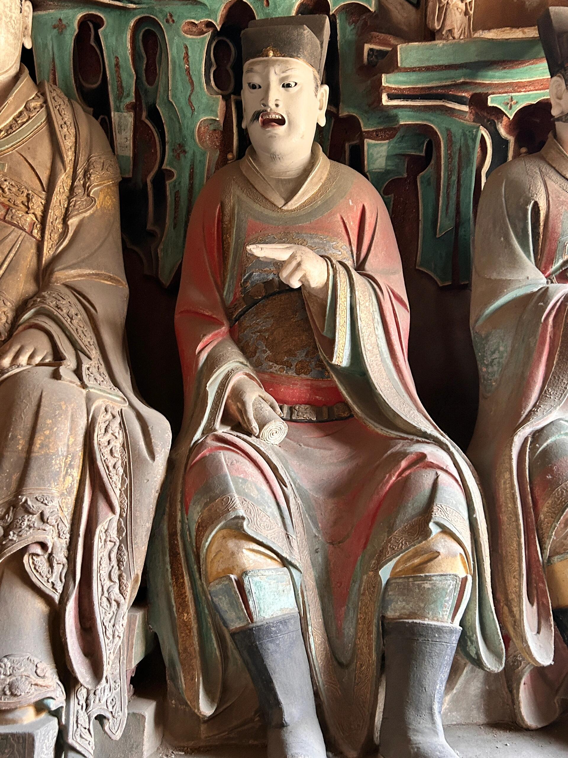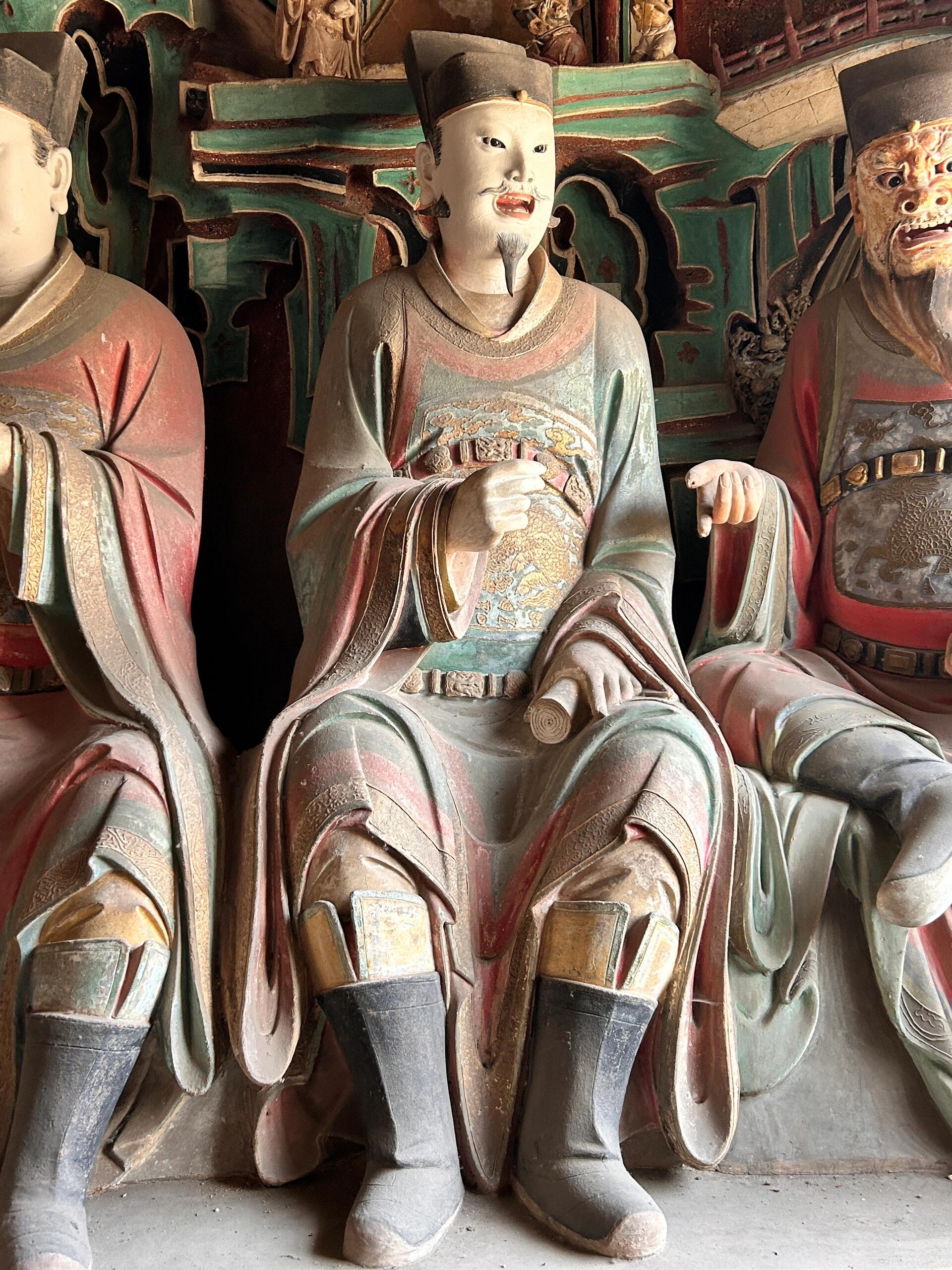 六曹判官站在阎君身边,更像一群办事的老吏。他们的官帽翅是硬的,斜斜插在脑后,像是刚从案牍前抬起头。有的手里攥着竹简,竹简边缘被捏得发亮,上面的字模糊了,可能看出刻得极深,一笔一划都透着股较真。有个判官的手指关节突着,指甲缝里还留着点泥色,大概是捏泥塑时,工匠顺手按上的自己的影子。他们不看阎君,也不看香客,都盯着自己的差事:管户籍的盯着竹简,管刑罚的摸着腰间的令牌,连站在最边上的那个,都在低头整理袖口,好像下一秒就要转身去翻卷宗。