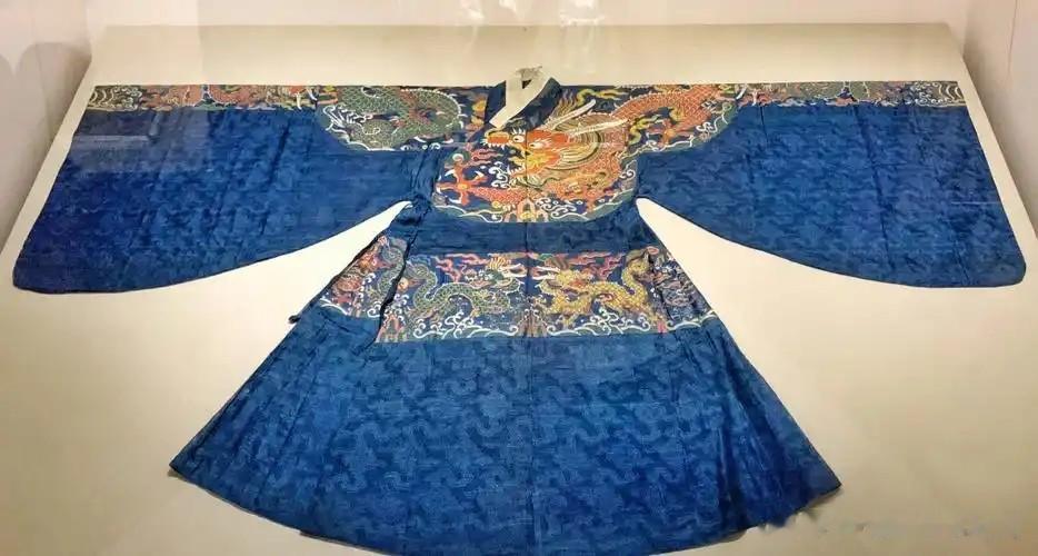 这批藏品中,既有蓝底盘金绣蟒袍——金线细如发丝,龙鳞盘绕绣制,灯光下光泽流转,是明代织绣工艺的巅峰之作