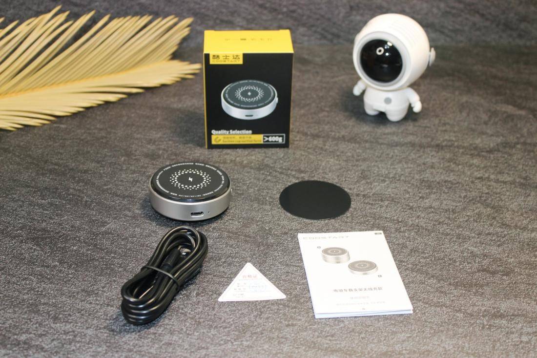 这款酷士达车载电吸无线充电支架的包装非常简洁,附件包含:支架主机 ×1、引磁环 ×1、USB-C充电线 ×1、说明书 ×1、合格证×1。