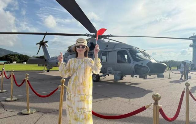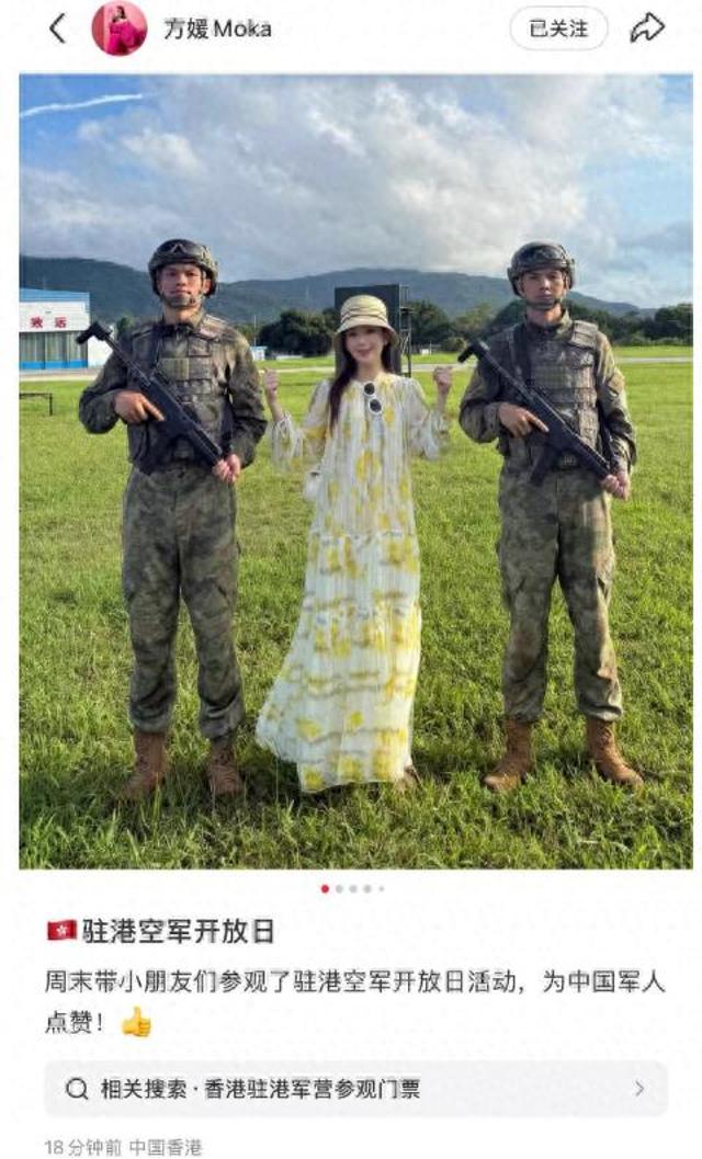 能够看到方媛头戴草帽,穿着宽松的黄色碎花长裙,状态相当不错,她竖着大拇指与帅气的空军战士们合影。