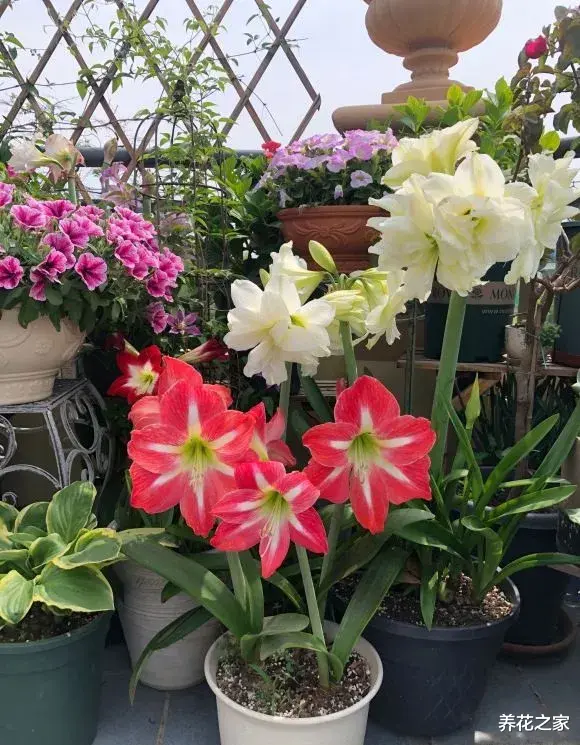 朱顶红,为石蒜科朱顶红属的多年生草本植物,花型呈喇叭状,花朵硕大,花色艳丽,观赏价值极高。朱顶红有着强大的球根,平日里植株从土壤中吸收养分储存在球根里,冬季将花盆搬到温暖的室内,植株再利用球根里储存的养分来开花。养护朱顶红,每年都需要更换新土壤代替旧土,给球根一个良好的生长环境。