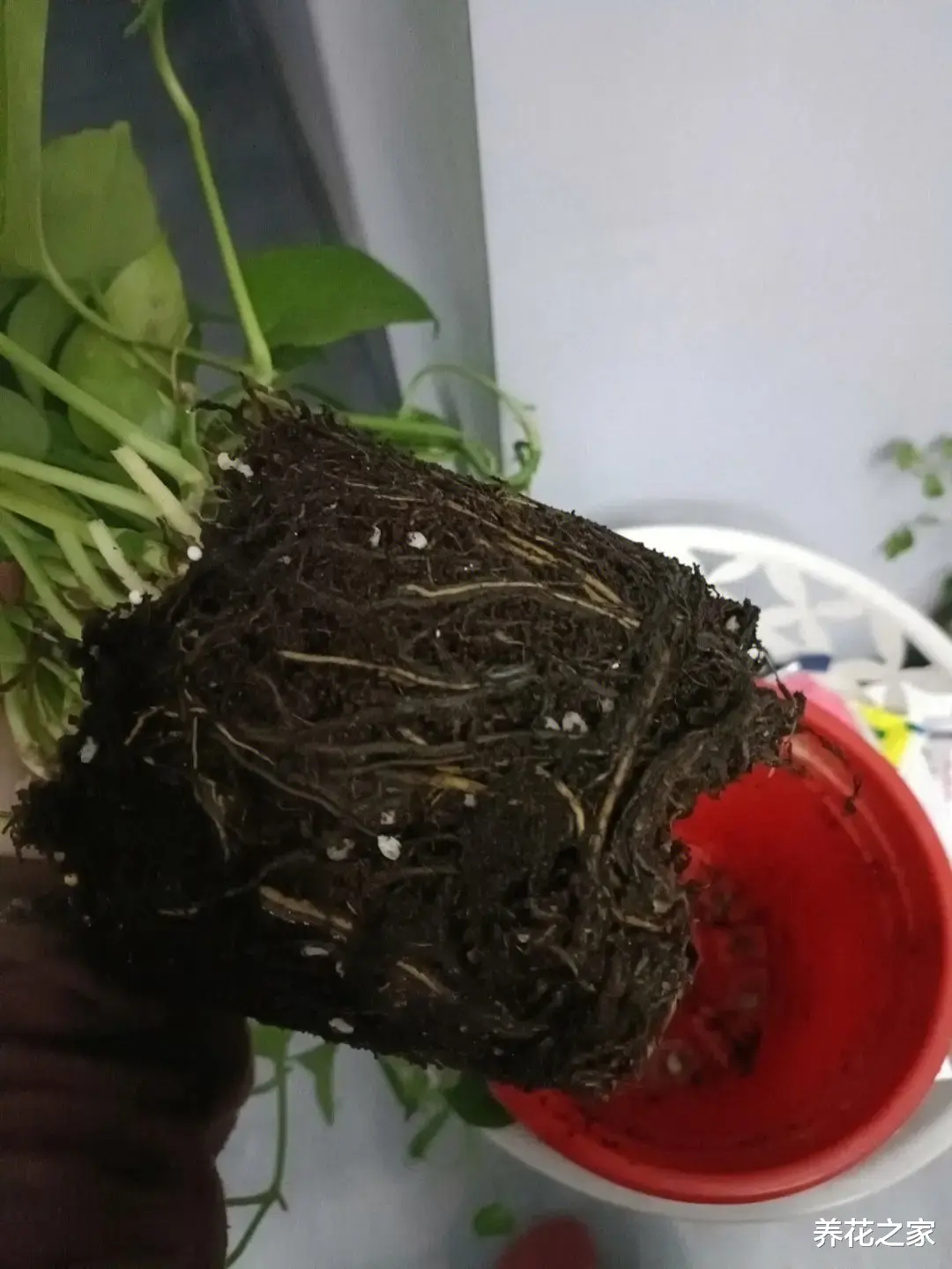 说到绿萝,相信没有人不认识它,它的枝叶浓绿,养护简单,价格便宜,就算再不喜欢养花的人,家里多多少少也会养上几盆。绿萝的生命力旺盛,根系生长速度极快,花盆里的土壤通常只能维持一年。超过一年以上不换盆,绿萝根系就无法吸收到足够的养分,会出现叶片发黄,不长新芽、枝条细弱等问题,严重影响观赏价值。