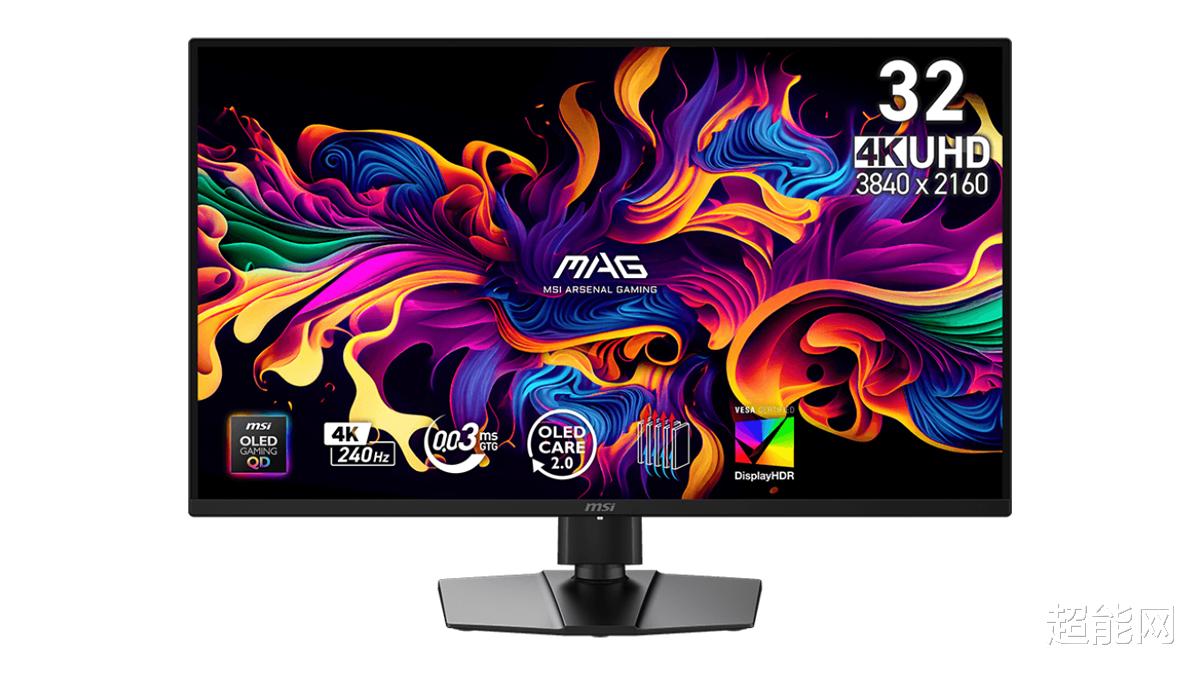 MAG 321UP X24采用了三面微边框设计,采用了一块31.5英寸的三星第四代QD-OLED面板,10bit色深,可视角度为178度(水平和垂直),分辨率为3840 x 2160,刷新率为240Hz,响应时间(GtG)为0.03ms,SDR/HDR亮度为300/1300尼特,动态对比度为1,500,000:1,DCI-P3色域为99%,Adobe RGB色域为97%,sRGB色域为138%,DeltaE≤2,支持Adaptive-Sync,得到了VESA ClearMR 13000和VESA DisplayHDR True Black 500认证。