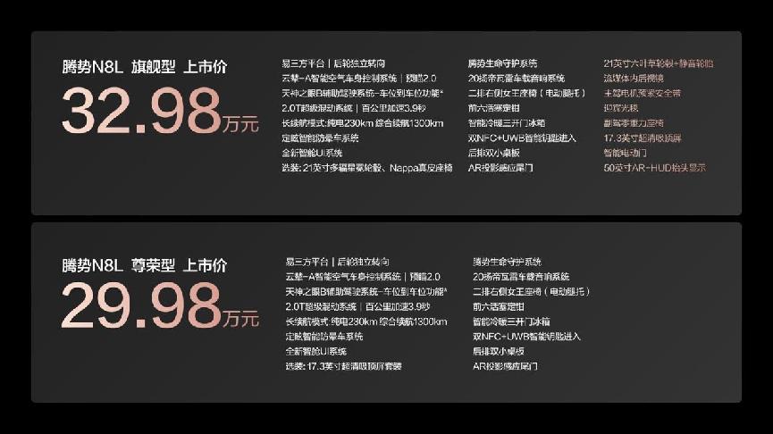 腾势N8L售价为29.98万元-32.98万元,上市以来持续热销,为回馈用户厚爱,推出限时购车权益,价值至高达10.67万元!包括价值1.7万元的三年免息,最高1万元的置换补贴。此外,在2025年11月30日24点前完成合同签署的用户,如果因非用户原因车辆未及时交付,导致开票实际发生在2026年,可享受购置税差额补贴,最高1.5万元!用户不必担心因为交车晚,而享受不到购置税补贴。