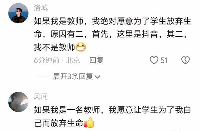 3、如果我是人民教师,我绝对愿意为了学生放弃生命。原因有两个,首先,这里是抖音,其二,我不是教师。