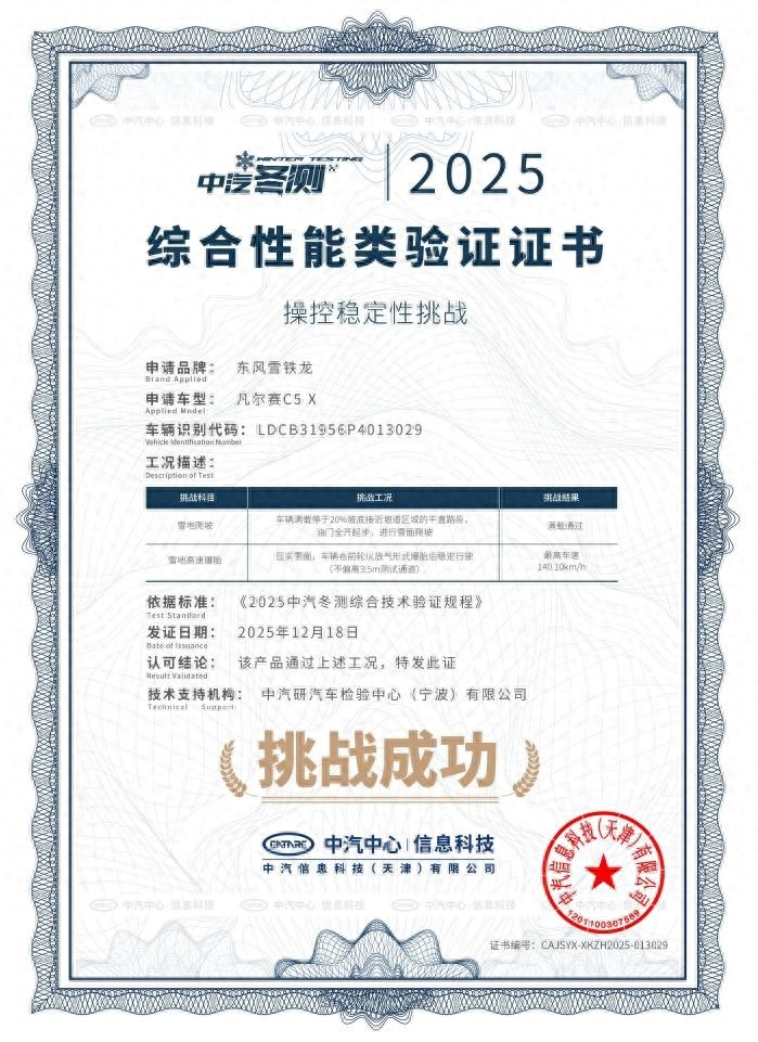 近日,在中国汽车技术研究中心权威举办的“2025极寒驾控安全主题技术验证”中,东风雪铁龙凡尔赛C5 X凭借卓越的整车稳定性与安全表现,成功通过“雪地高速爆胎”与“雪地爬坡”两项极端挑战,获得中汽中心“操控稳定性挑战”认证证书。其中雪地高速爆胎通过车速高达140.10 km/h,20%雪地爬坡实现满载顺利通过,展现出在极寒环境下深厚的驾控安全功底。