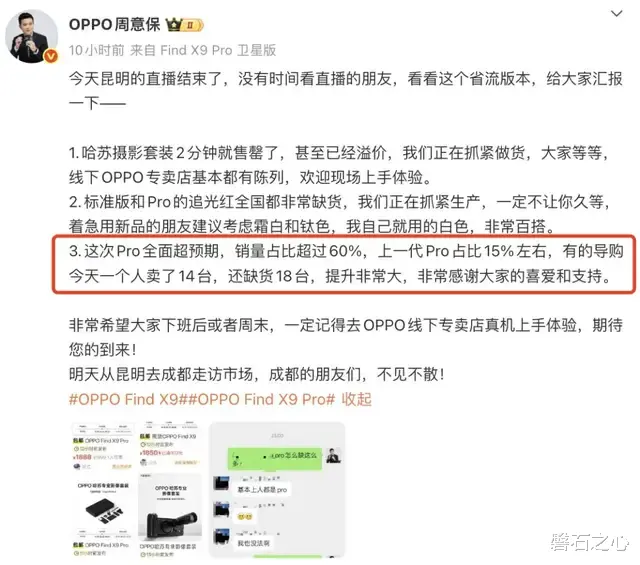 据了解,OPPO方面虽然已将备货量提升至往常的3倍,但热门配色仍在首销日被抢购一空,部分门店连样机都需要轮流充电供顾客体验。OPPO Find系列产品负责人周意保也公开表示,标准版和Pro版的“追光红”在全国范围内都非常缺货,公司正在加紧生产。甚至有渠道反馈,像重庆地区某些版本的“追光红”在首销前就已预订完毕。