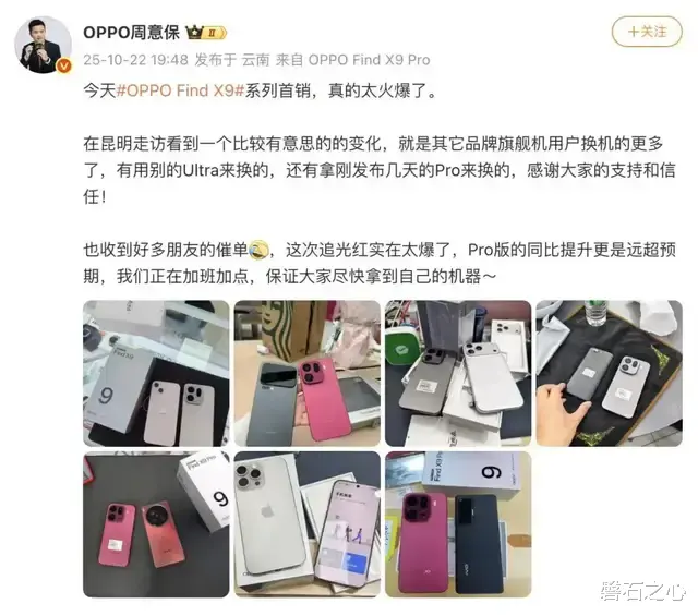 OPPO Find系列产品负责人周意保在首销当日于社交媒体发文称:“其它品牌旗舰机用户换机的更多了,有用别的Ultra来换的,还有拿刚发布几天的Pro来换的,感谢大家的支持和信任!”