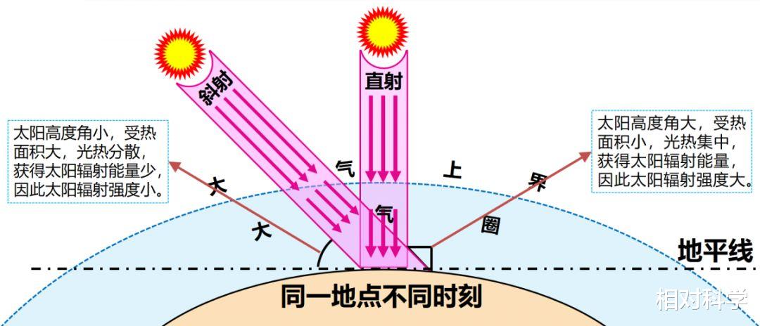事实上,真正能主宰地球上气温变化的关键是太阳高度角。在同一个地方的同一天,太阳刚升起来时,高度角较低,而到了正午附近,高度角相对较高。太阳高度角越高,太阳光穿过的地球大气层厚度越小,能量损失越少,就有更多更集中的太阳能量照射地表,所以气温就会更高。