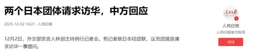 针对这些访华请求,中国外交部发言人林剑在12月2日的例行记者会上作出回应,表示注意到日本国内有识之士对高市早苗错误言论引发的严重后果深感忧虑。
