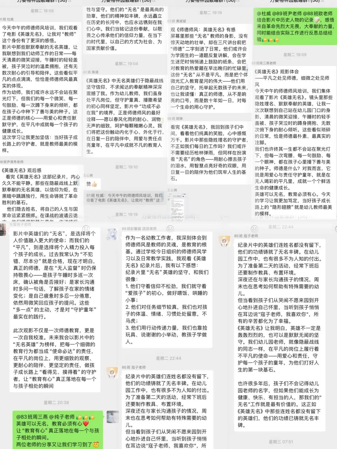 万婴格林幼儿园采用“集中学习 + 日常渗透”的双线模式,推动师德师风建设常态化、长效化。一方面,组织全体教师观看红色教育影片《英雄无名》,影片中革命先辈坚守理想信念、无私奉献的精神,引发教师群体的深刻共鸣。观影结束后,教师们结合自身工作实际分享感悟与思考,一致表示将把“坚守”与“责任”的精神融入幼教工作,以更高标准严格要求自己;另一方面,建立“日常师德师风警示机制”,安排专人定期收集网络媒体报道的教育领域典型案例,每周在教师例会上选取1到2个案例进行分析学习,引导教师时刻保持警醒、杜绝麻痹思想,从源头上防范失德失范行为的发生。