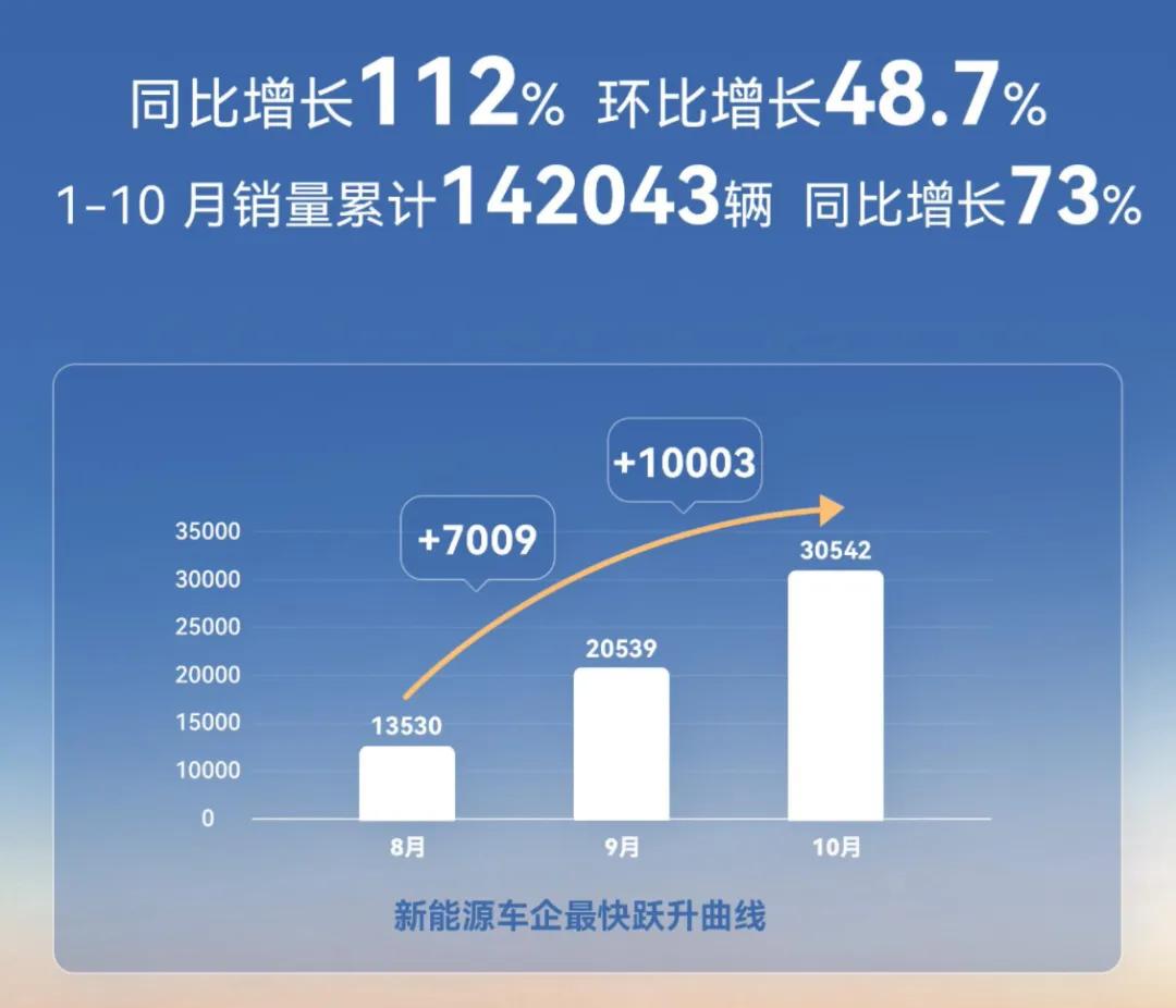 官方数据显示,北汽新能源10月单月销量首次突破3万台大关,达到30542台,同比劲增112%;今年1—10月累计销量达到142043台,同比增长73%。