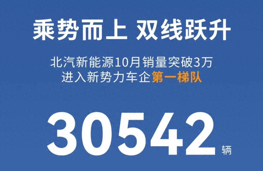 进入“金九银十”传统销售旺季,北汽新能源交出一份强势增长的成绩单。官方数据显示,北汽新能源10月单月销量首次突破3万台大