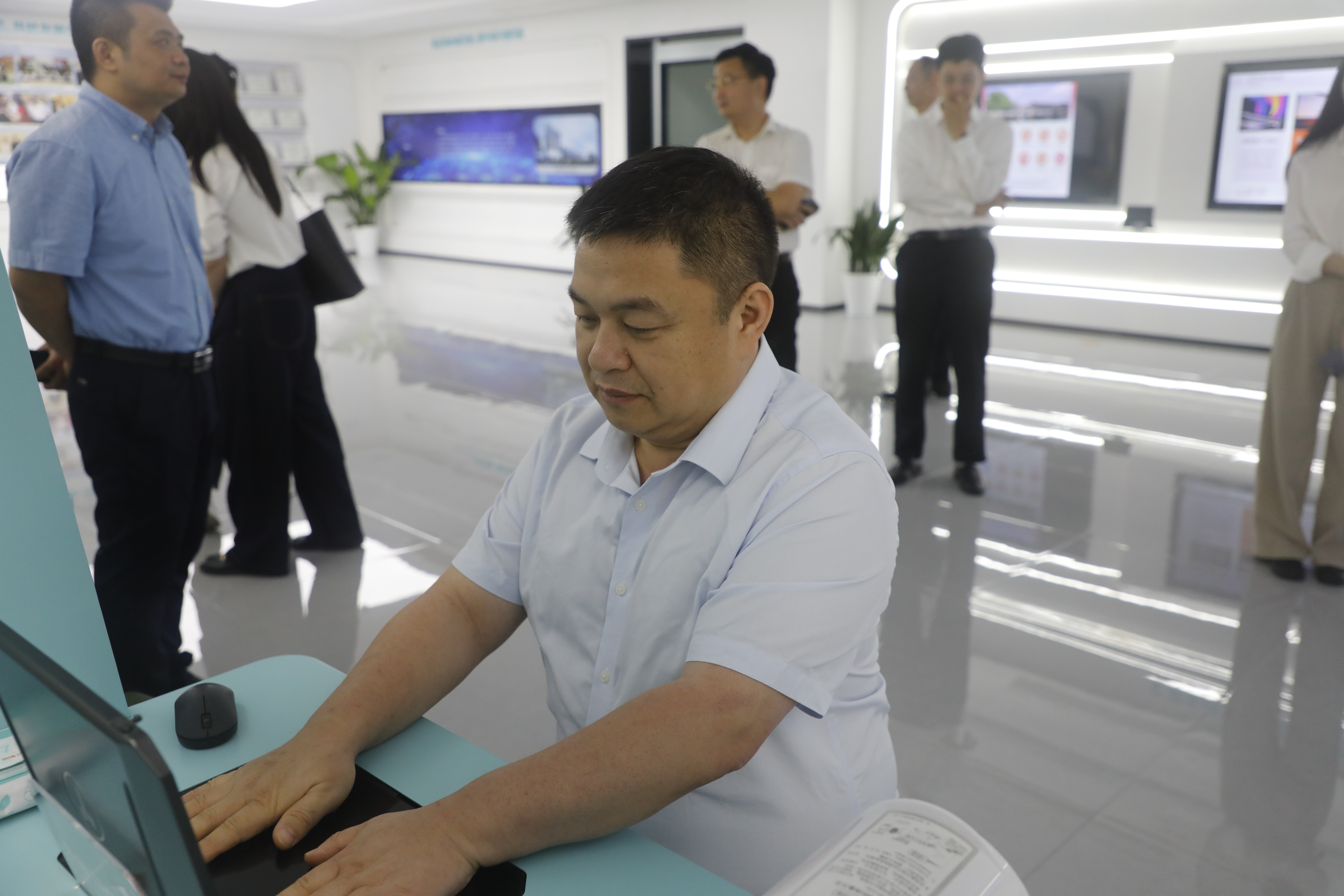 考察团一行饶有兴致地参观了梅清科技现代化展厅,全面了解了企业在科技创新、产品研发等领域取得的最新成果。王三防市长亲身体验了非接触式银医通、无创健康评估仪等创新产品,并对梅清科技在技术创新和产品研发方面的成就给予了高度评价。