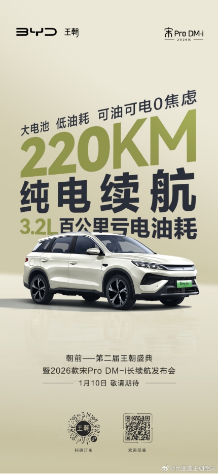 关注宋Pro DM-i长续航版的消息,纯粹是因为我那颗总想往外跑的心。我是个户外爱好者,每到周末就琢磨着带家人去城郊的湖边、山脚露个营,或者去隔壁城市探个店。现在开的油车,跑远路油费实在不低,每次出发前都得做点心理建设。所以刷到微博说1月10号要上市个纯电续航能达到220公里的宋Pro DM-i,我立马就来精神了。