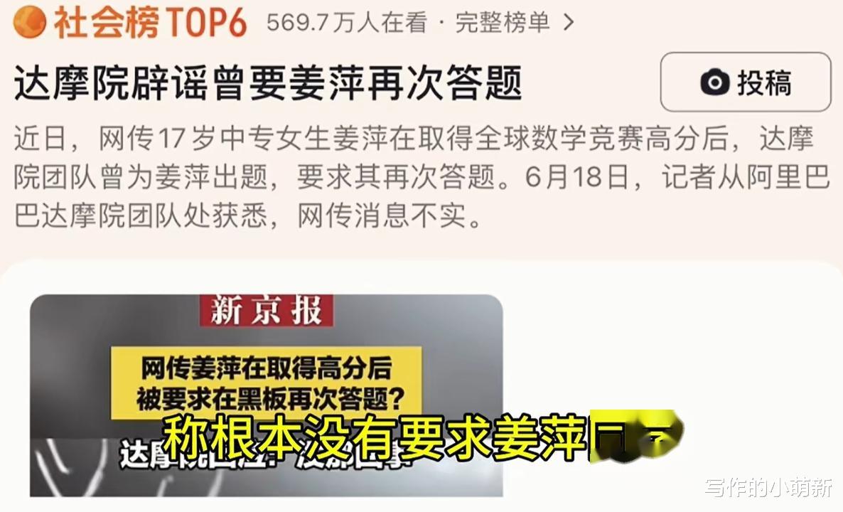 一个开卷考试的成绩本身就是选手入决赛的门槛赛,一切都等决赛的结果,把这个成绩拿来炒作,你觉得合适吗,炒作本身就有问题,但这些问题不是姜萍的问题,而是炒作者的问题