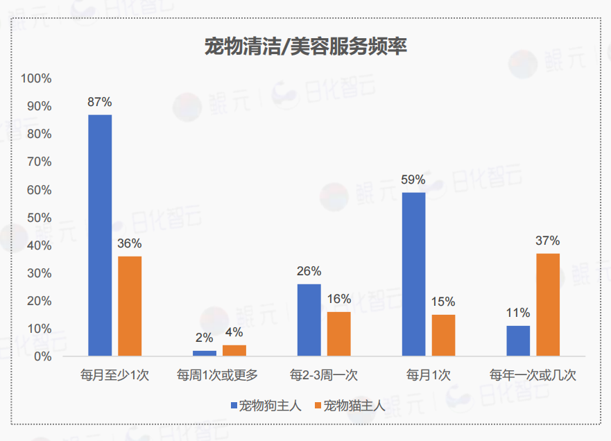 由于宠物狗的生活习性,其对专业的清洁或美容服务有着更高的需求,尤其是一些大型犬种。因此,无论是在家中为宠物洗澡,还是前往专业场所进行清洁护理,狗主人相较于猫主人通常需要更频繁地为宠物进行清洁工作。
