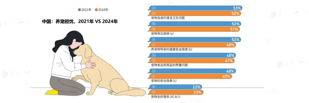 宠物主养宠最大的担忧依然集中在清洁卫生问题、宠物的疾病健康问题、产品质量问题、宠物的不良生活行为和安全隐患等。但这些围绕宠物基本生存需求的担忧在这两年几乎都略有下降。而担心“宠物友好服务太少”的宠物主占比则略有上升。