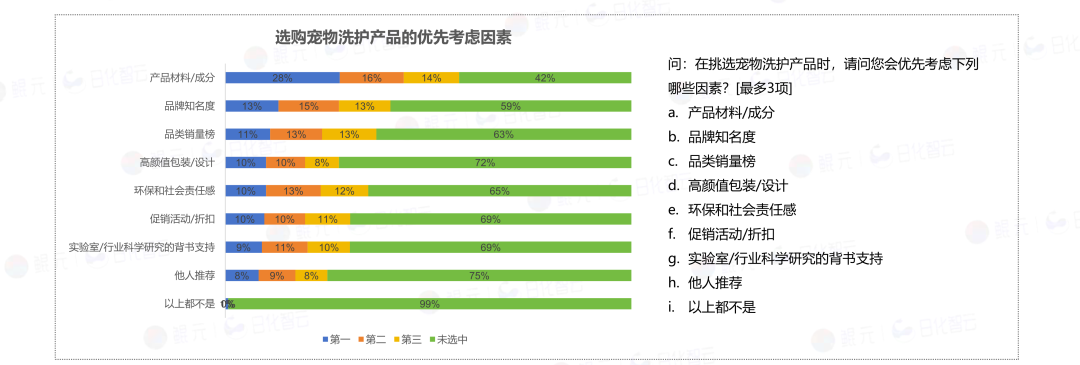 宠物主在选购宠物洗护用品时,“产品材料/成分”是他们最先考虑的第一因素,并远超过其他因素的占比。可见大部分宠物主在选购宠物商品时都是比较理性、注重科学的,希望通过对产品材料/成分的“严选”,为宠物提供最有益的产品。
