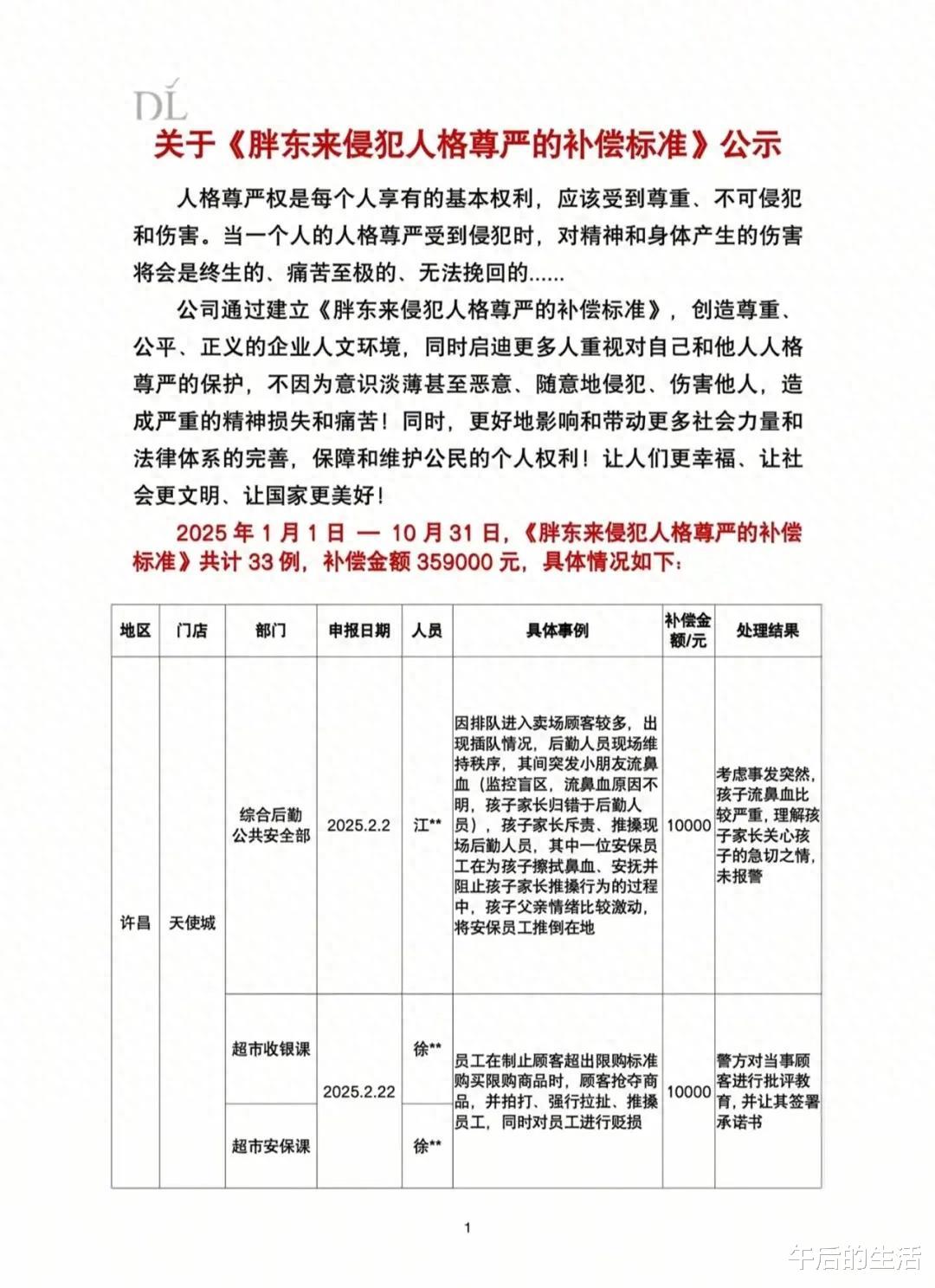 这份温暖,源于胖东来对人格尊严的极致守护。2025年11月17日,集团官网公示《侵犯人格尊严补偿标准》,详细披露33起员工受辱案例及补偿明细。其中,许昌北海店电工程某某的遭遇尤为典型——1月26日,他在劝阻辱骂员工的顾客时,突遭对方两次掌掴。警方介入后,顾客家属出示精神疾病证明,胖东来仍给予3万元补偿。这33起案例中,补偿金额从3000元到3万元不等,涉及掌掴、辱骂、推搡等多种情形,处理结果既有警方调解,也有行政拘留。