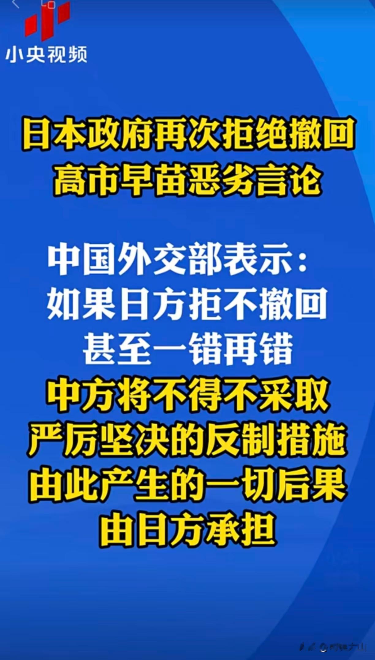 日本不撤回高市错误言论,表明武力介入台湾是其政府既定立场