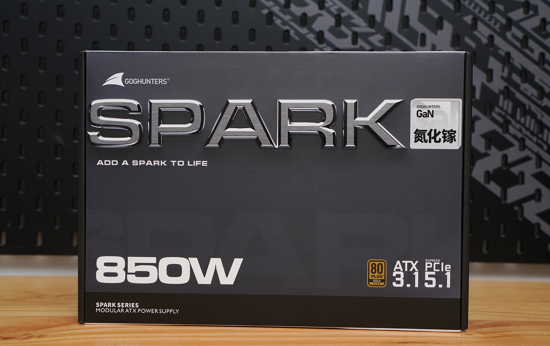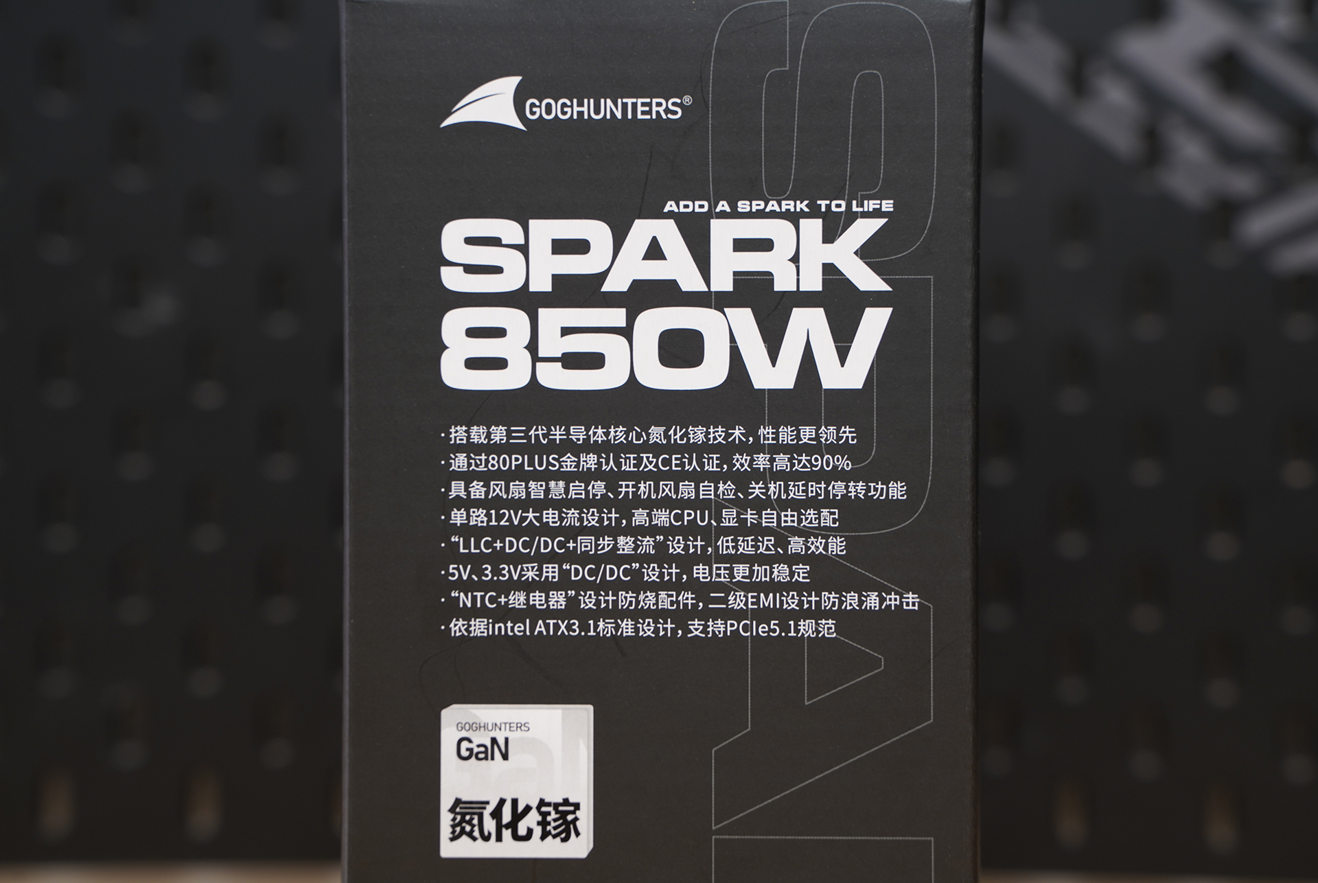 长城SPARK 系列 850W 全模组 ATX 电源,整体风格偏向高端与专业定位。正面清晰标注 80 PLUS Gold 金牌认证,并支持 ATX 3.1 与 PCIe 5.1 新规范,面向新一代高功耗平台。右上角醒目的 “GaN 氮化镓” 标识,强调其采用氮化镓方案,主打更高效率与更高功率密度,为高性能装机提供稳定且前瞻的供电基础。
